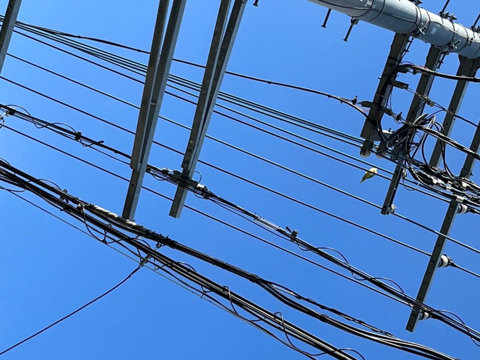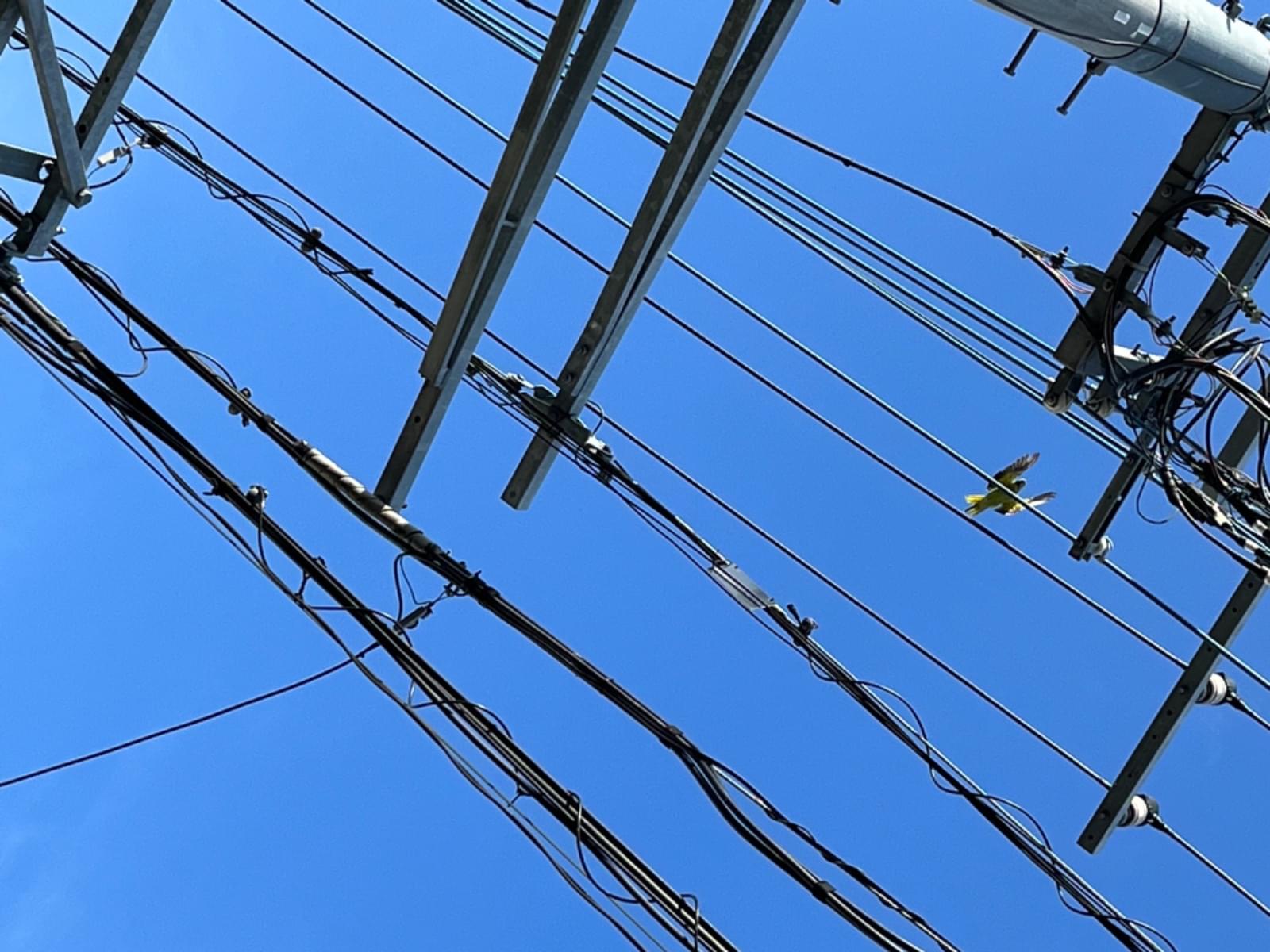 電線に止まっていたので全体像が分かりませんが、恐らくセキセイインコと思われます。
