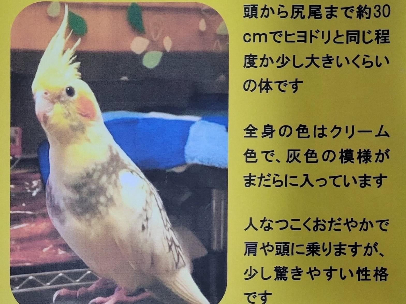 7月5日13時頃、不注意で逃してしまったオカメインコのキィちゃんを探しています。