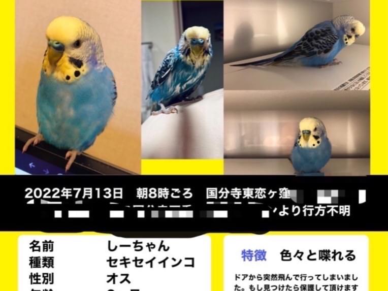 頭が黄色で体は青のセキセイインコが迷子になりました。