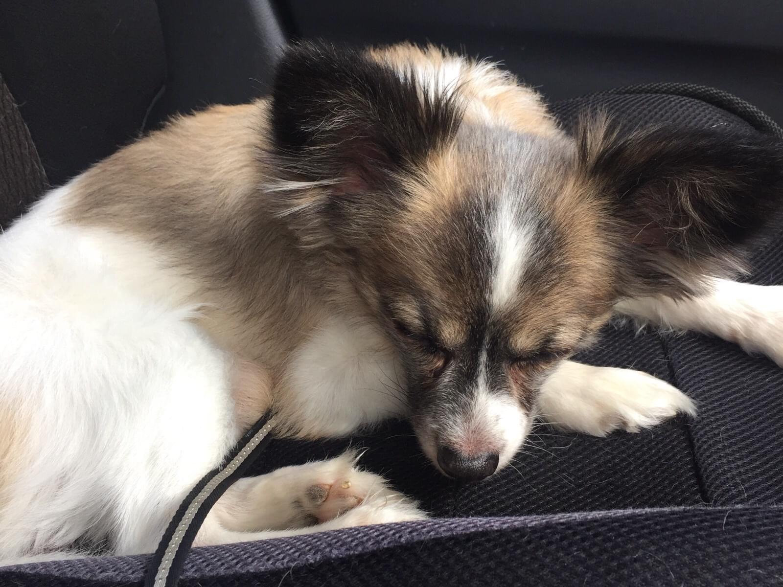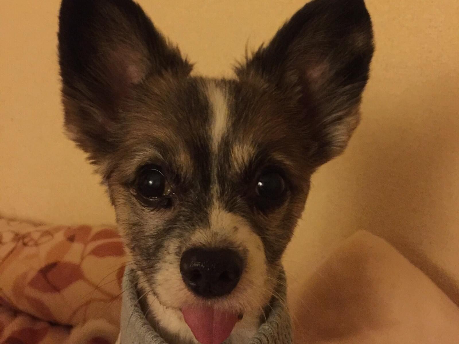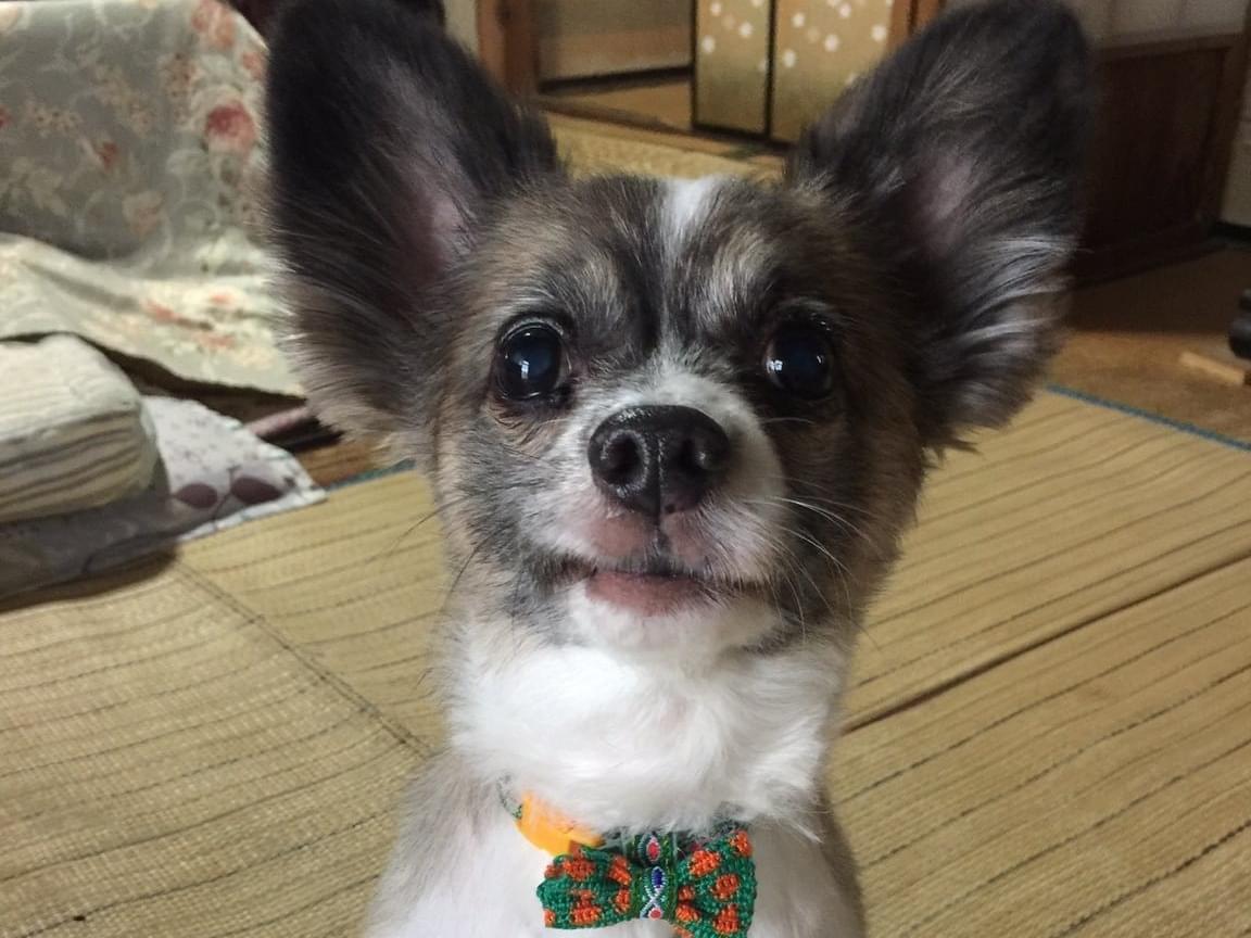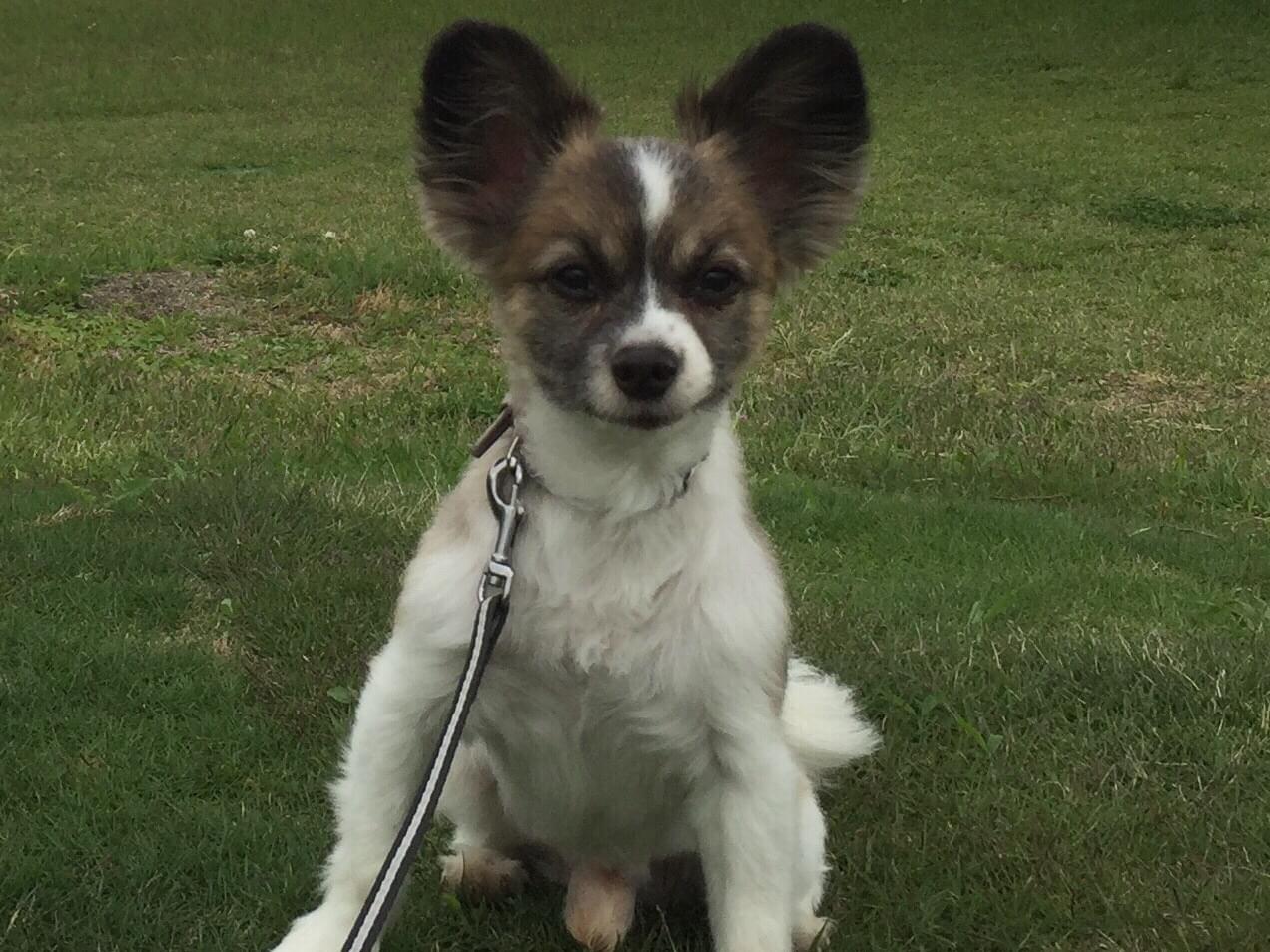 水色の首輪を着けた耳の大きい白と茶色のパピヨン犬を探してます