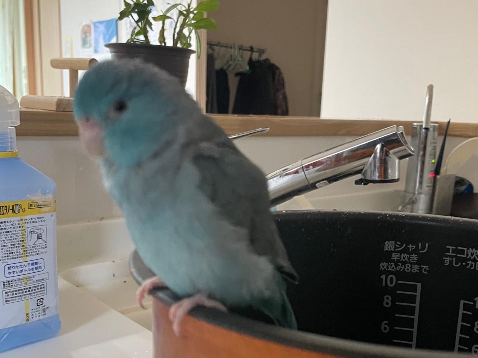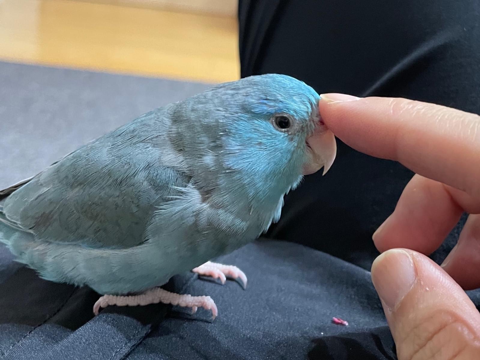 ブルー(水色)でクチバシは薄いピンクです。手乗りですが、やや臆病です。名前(アクア)メス。