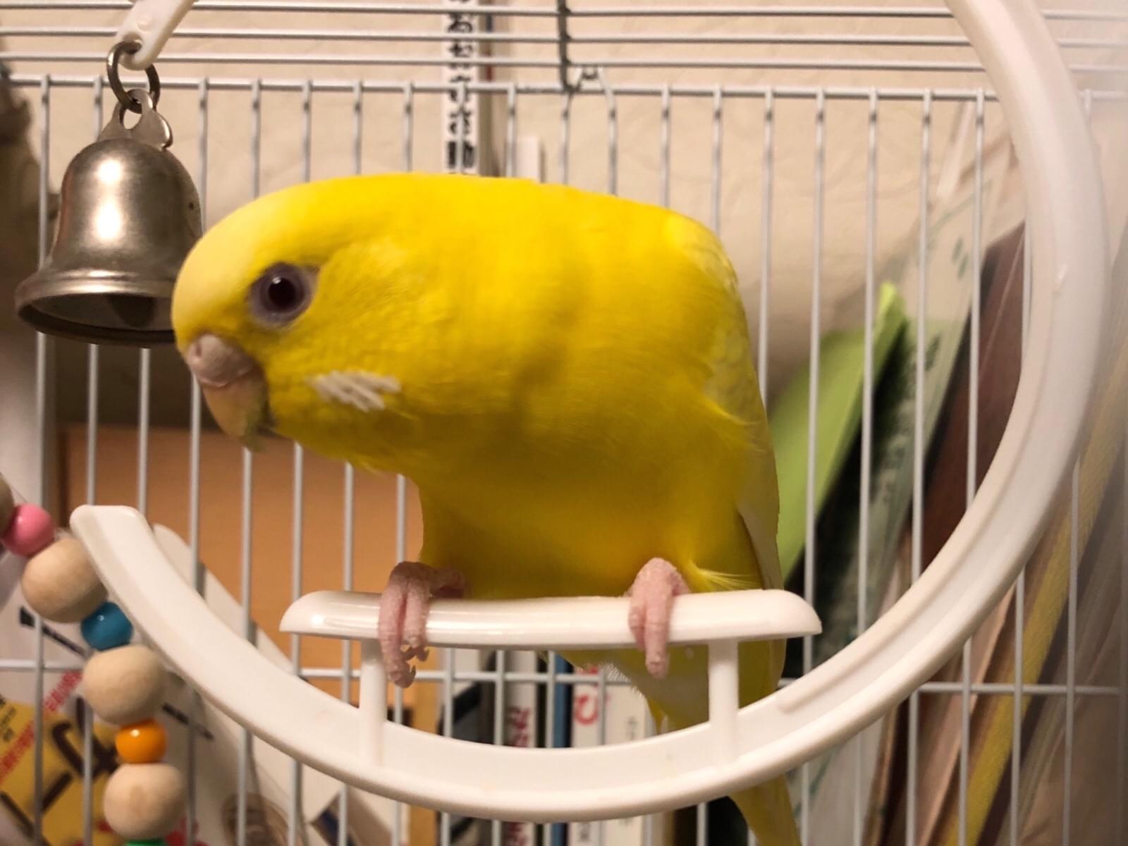 黄色で赤目、頬は白のセキセイインコで、時々「まるちゃん」としゃべります。