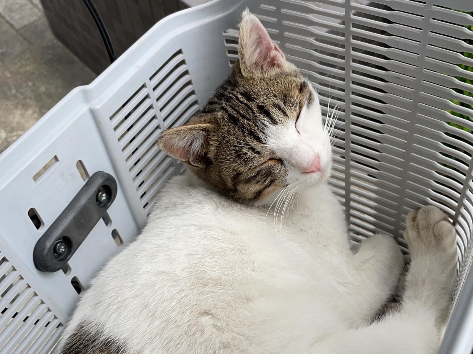 さくら耳で白グレー茶色。顔の辺りはグレー茶色で体は白色です。お尻辺りにハート型の模様があります【グレー】
