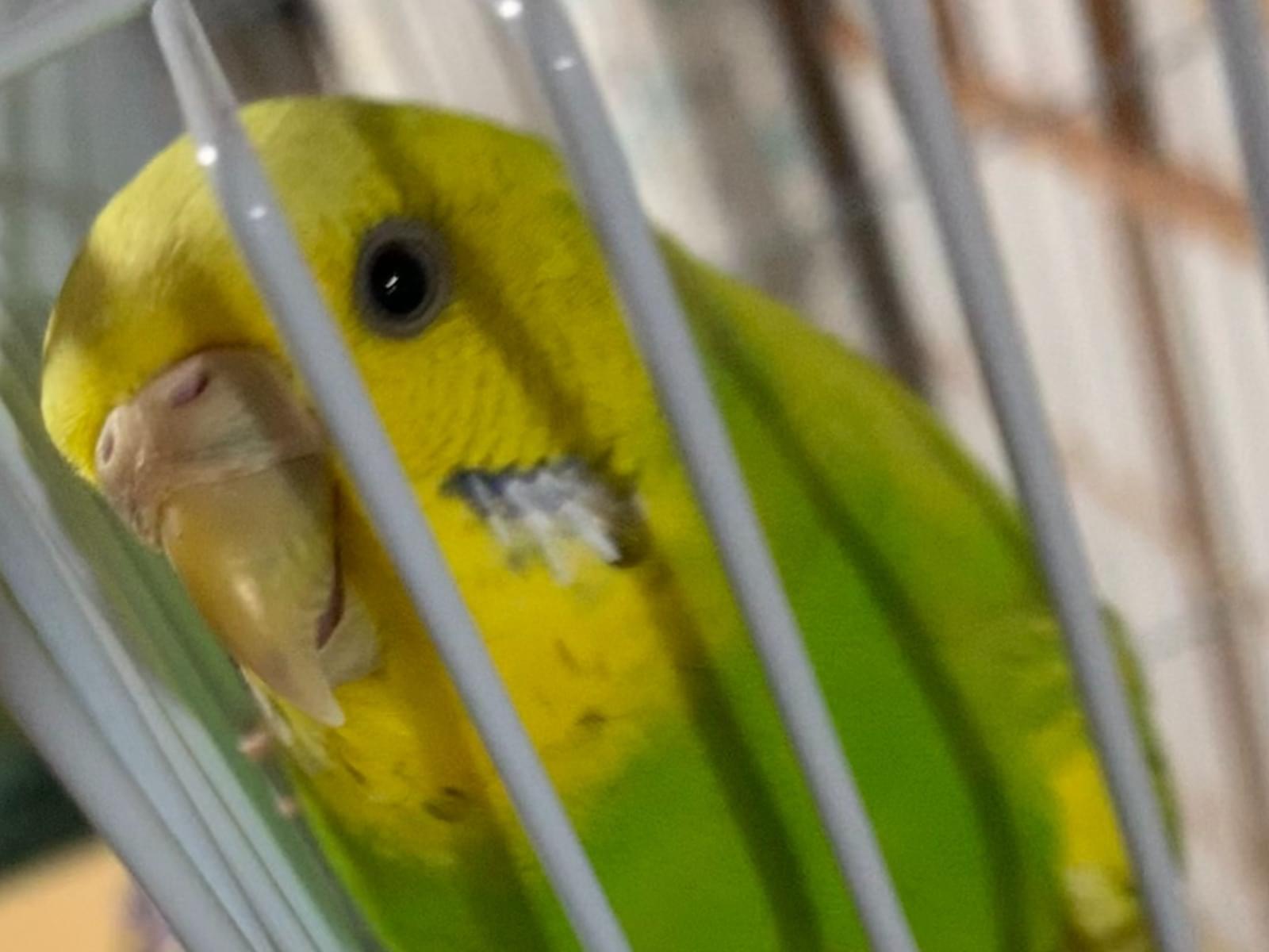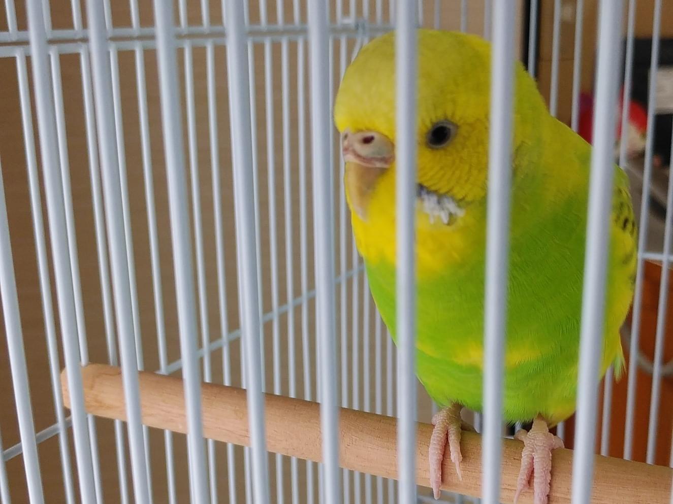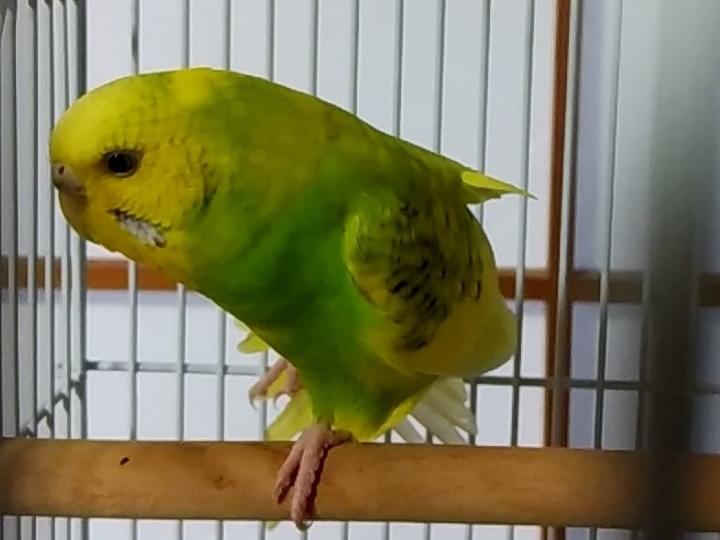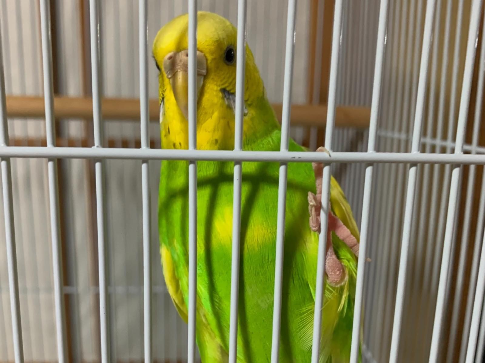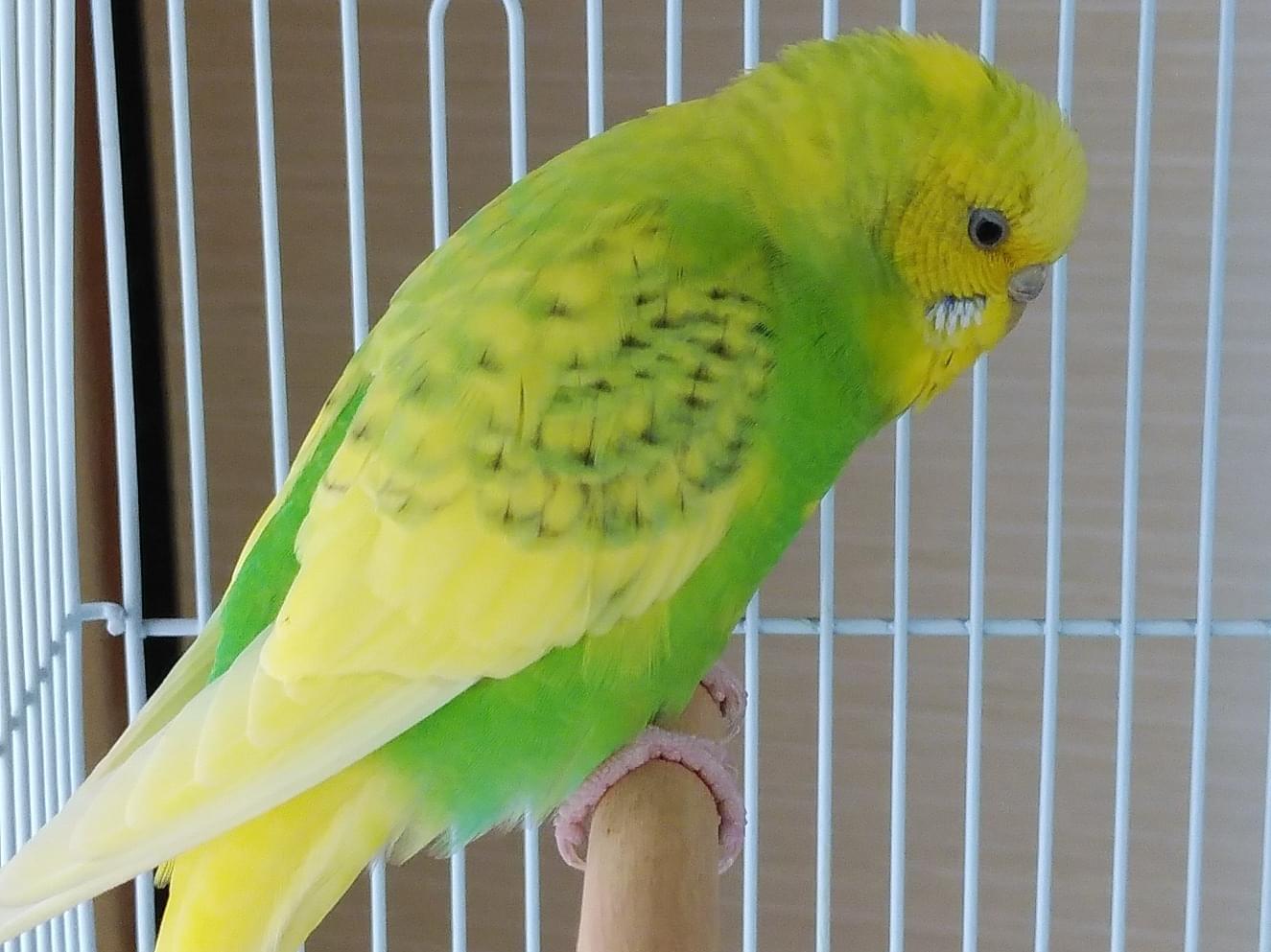 羽の先と尾は黄色です。お腹は黄緑色、翼の肩の部分は黄緑色に薄めの黒が入っています。顔のほっぺたに白の丸い模様があります。その白の上にうっすらと青色のラインがあります。