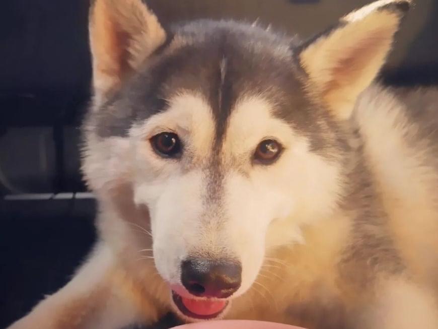 赤い首輪と赤いハーネスを着けたシベリアンハスキーの迷子を捜しています