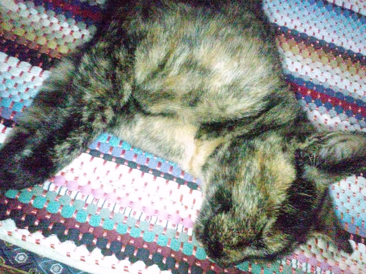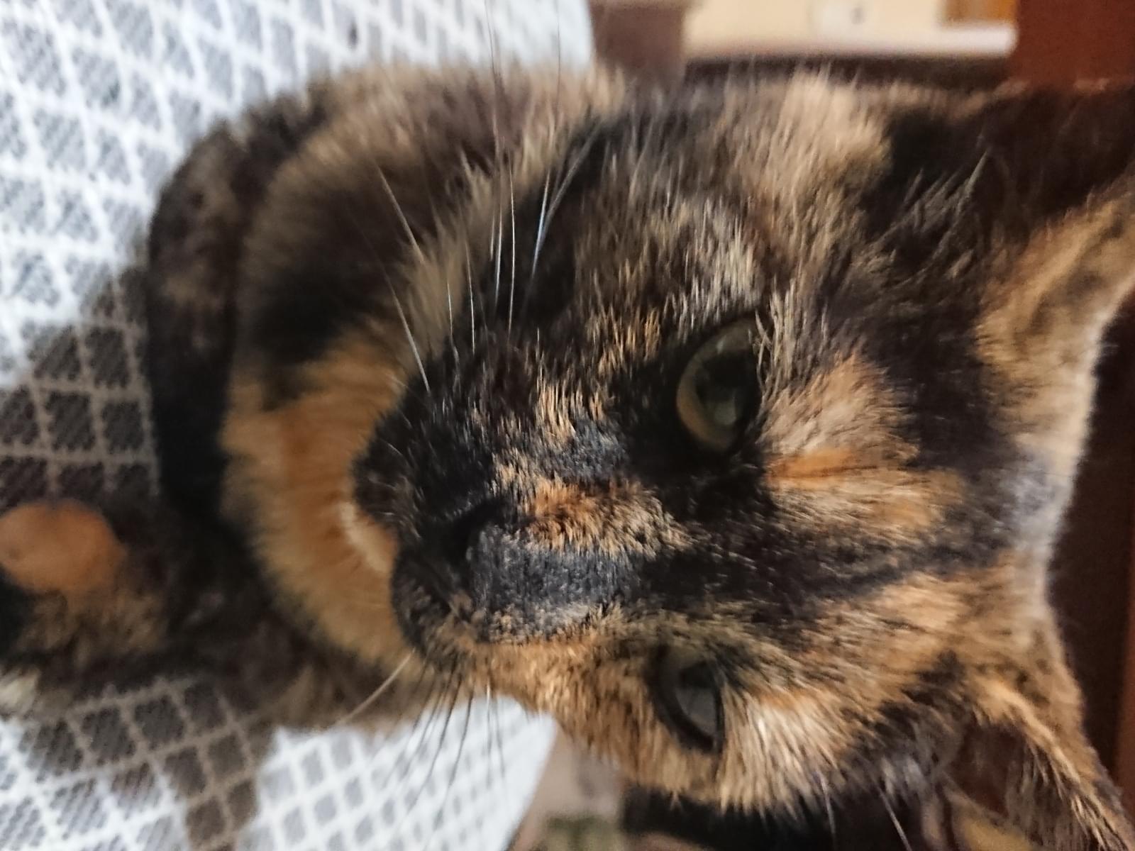 茶色と黒のまだら(べっ甲模様)、オレンジ色の首輪に名札あり避妊手術済で耳カットなし、体長約40センチ細身体型3キロ台しっぽ長い