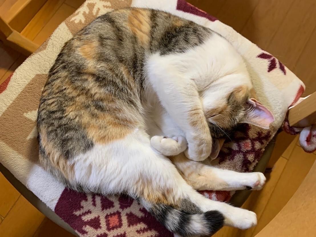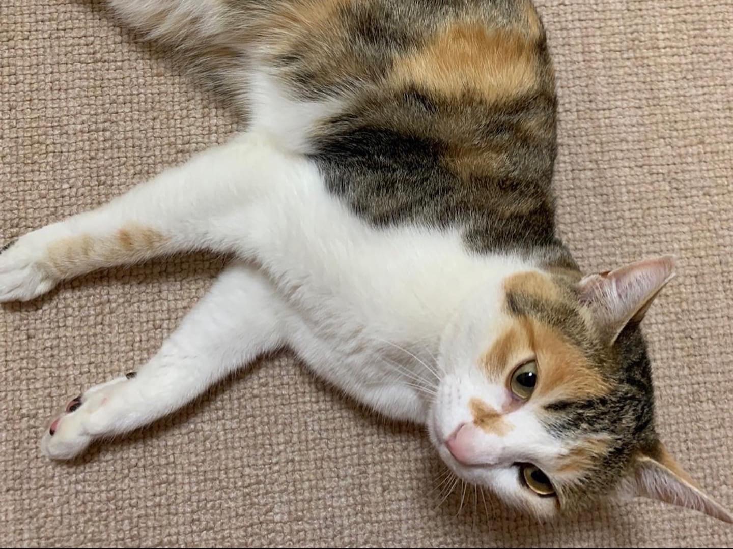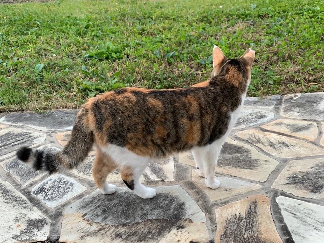 お腹側と足が白、背中側が茶色(茶トラ)とキジトラが混ざった感じで、しっぽは少し太めの縞模様です。右耳にV字のカットがあります。