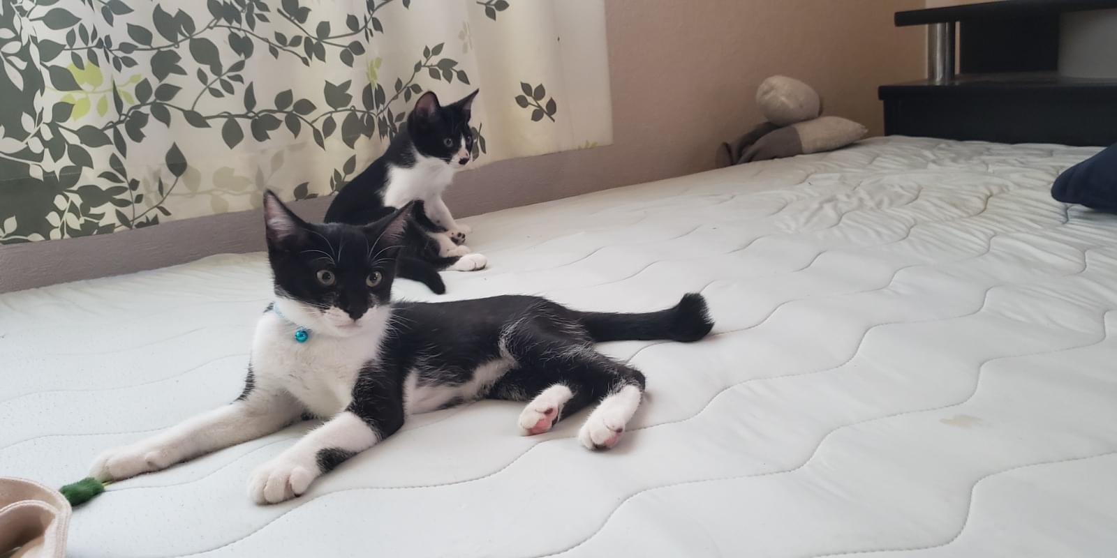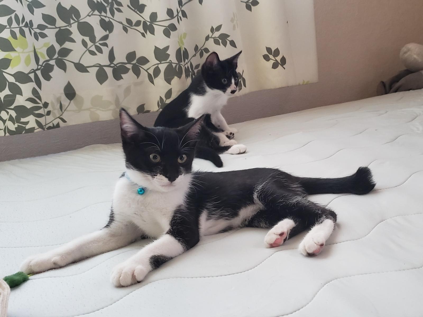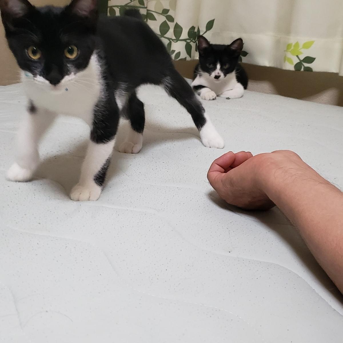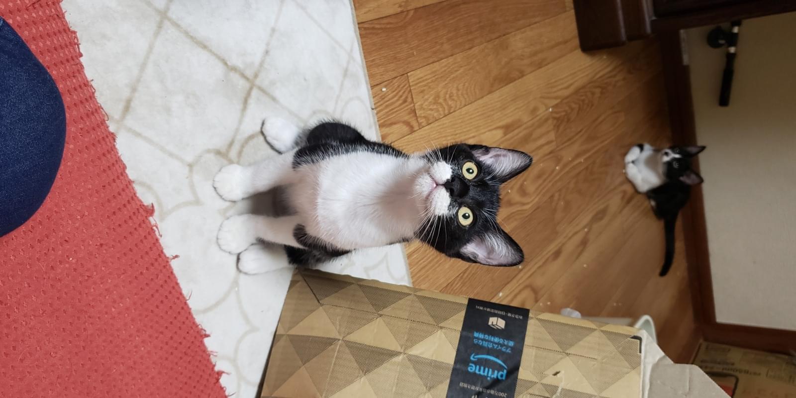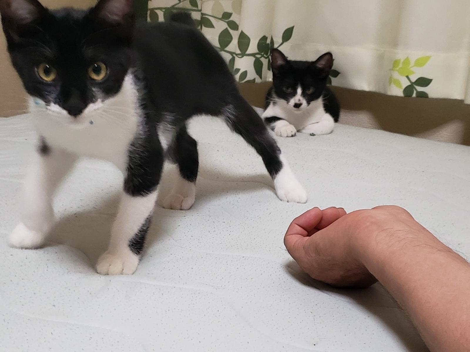 宅配の対応をしている隙に、玄関の脱走防止策隙間より兄妹で外に出てしまいました。首輪は水色のスエード革ひも+水色の宝来鈴を付けて居ます。