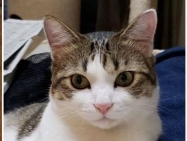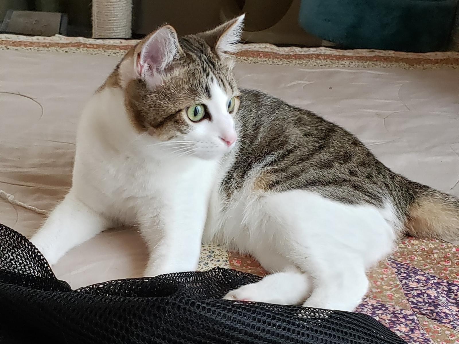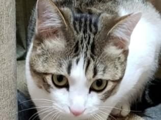 臆病で怖がりです。目から下、足は白く、目の上辺りからサバトラ模様です。しっぽは長くしま模様でカギしっぽ.首輪なし