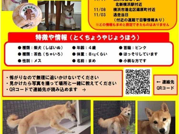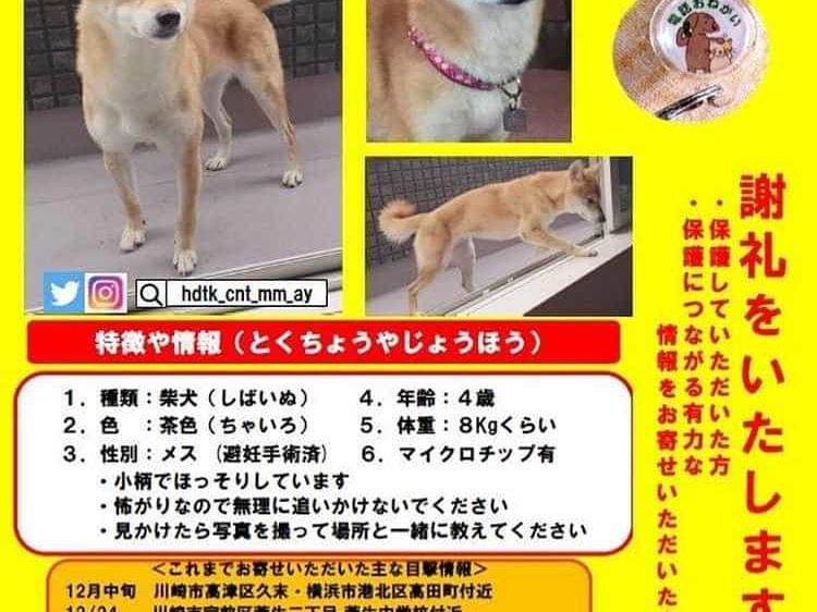 目撃した方、保護した方、また、その頃より似た柴犬を拾って飼っている方など、心当たりのある方は情報をお寄せ下さい。