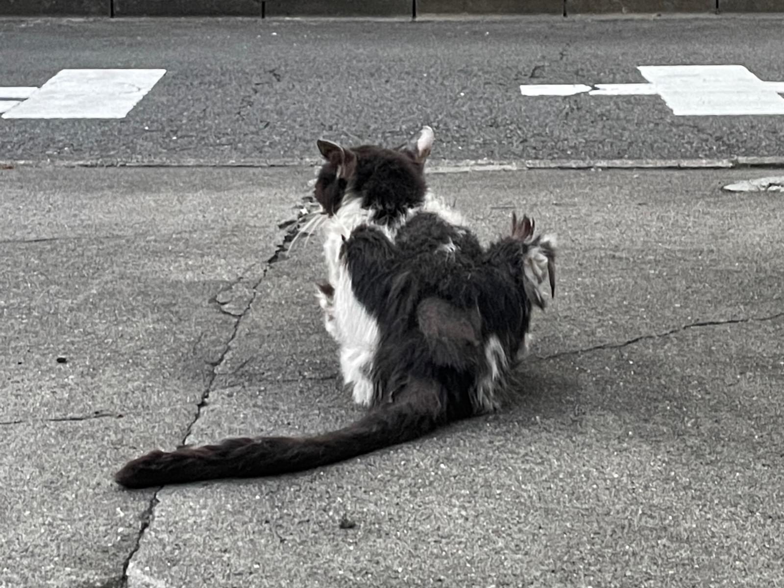 散歩していると、休んでいる猫ちゃんを目撃しました。身体の汚れや痩せ具合が印象的でした。