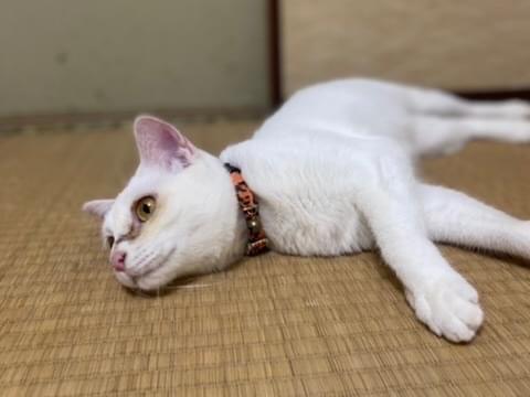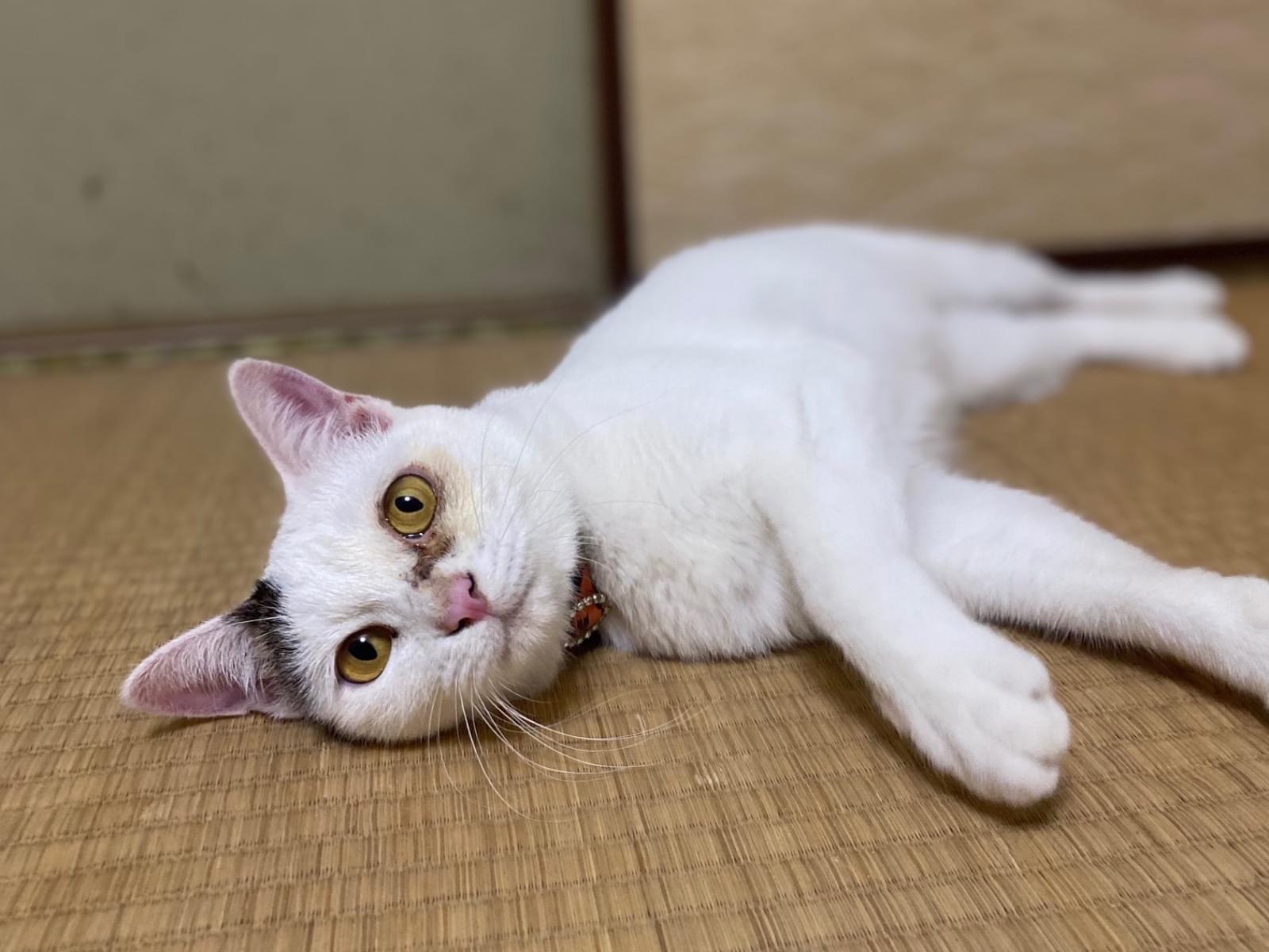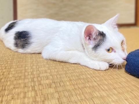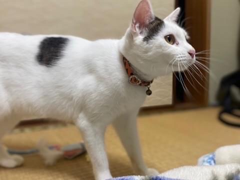 白がメインで右耳と腰に2つのキジトラ柄が混ざったぶち柄があります。
