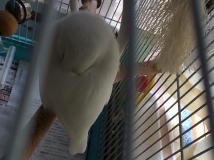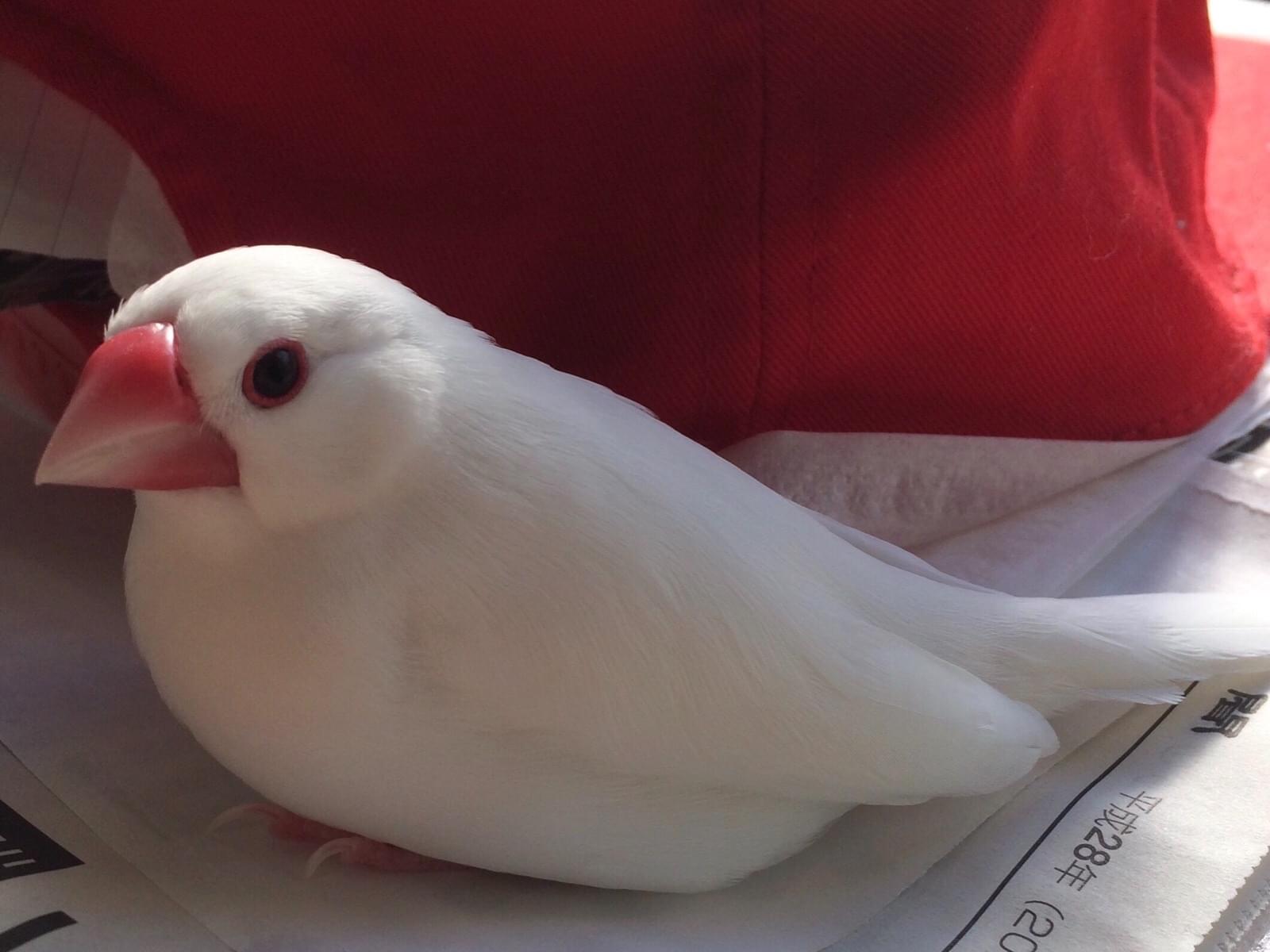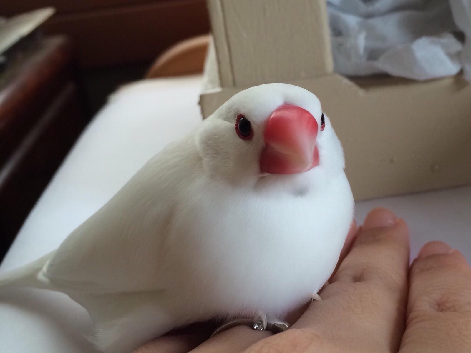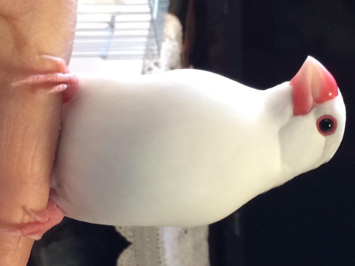 体長は13センチ位、真っ白な文鳥で、くちばしは赤く、目は大きめです。