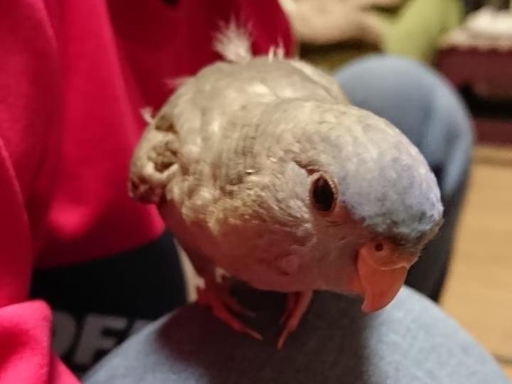 灰色がかった青色で黒い斑点のある羽をしたサザナミインコです。まだ若く、飛び方が少しおかしいです。あまり人に慣れてなく、噛むこともあります。体長10〜15cm程で、あまり鳴きません。鳴き声は低めのくぐもったような声をしています。人をよくじっと見つめてきます。見つけた方はご連絡ください!