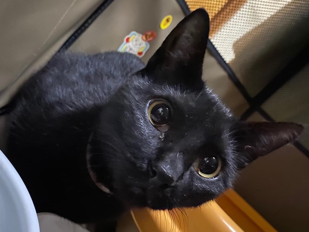真っ黒の1歳行ってるか行ってないかくらいの猫ちゃんです。お目目は黄色で元々ピンクだったのか色あせて薄ピンクになってるノミ取りの首輪付けてます。凄く人懐こくあまり外に慣れてない感じです。避妊済み。1時間待っても帰る気配もなく家が分からない様子でしたのでウチで保護しています。