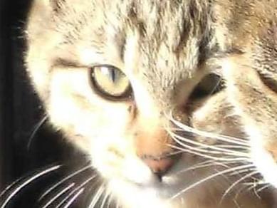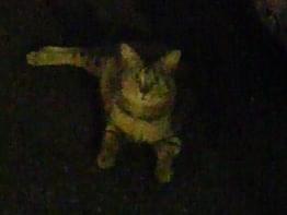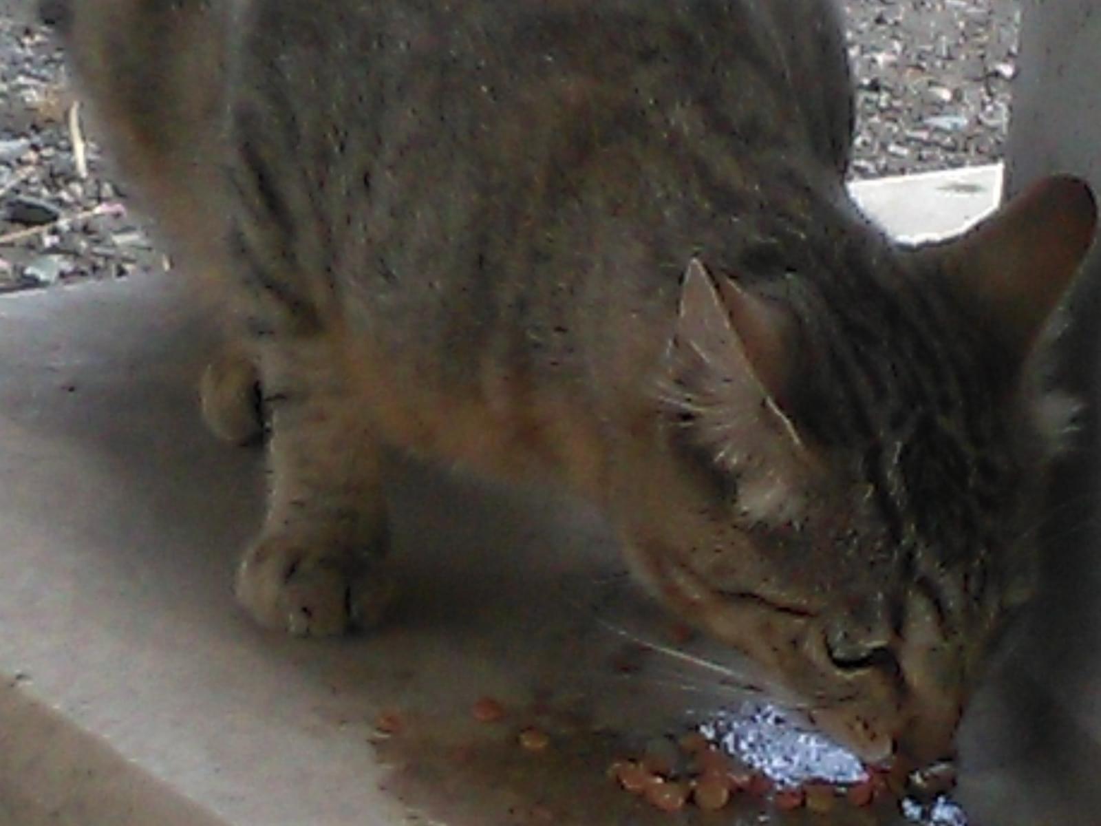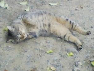 キジトラのオス。首輪はしていません。特徴は尻尾が太くて短く、甲高い声で鳴きます。性格は少し臆病なところがあります。