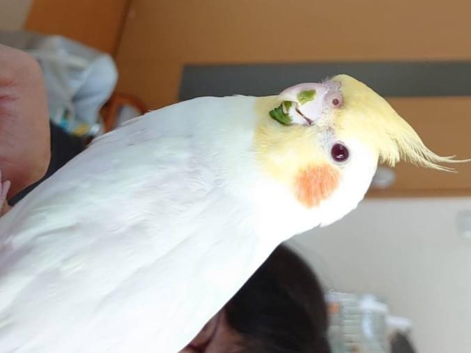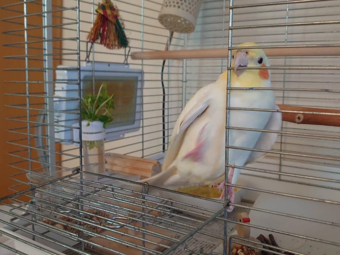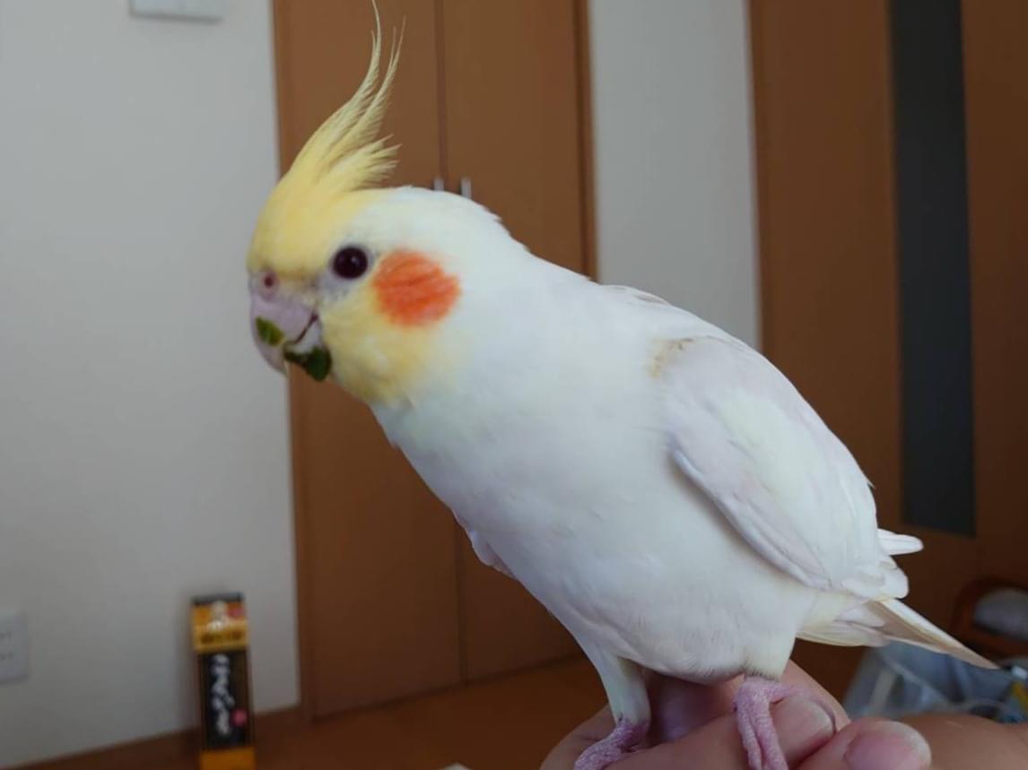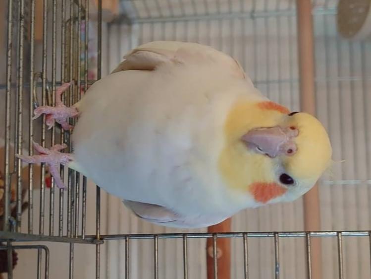 2才のオスで、・体色はベージュがかった白、頭部は黄色でほっぺたがオレンジ色をしています。
