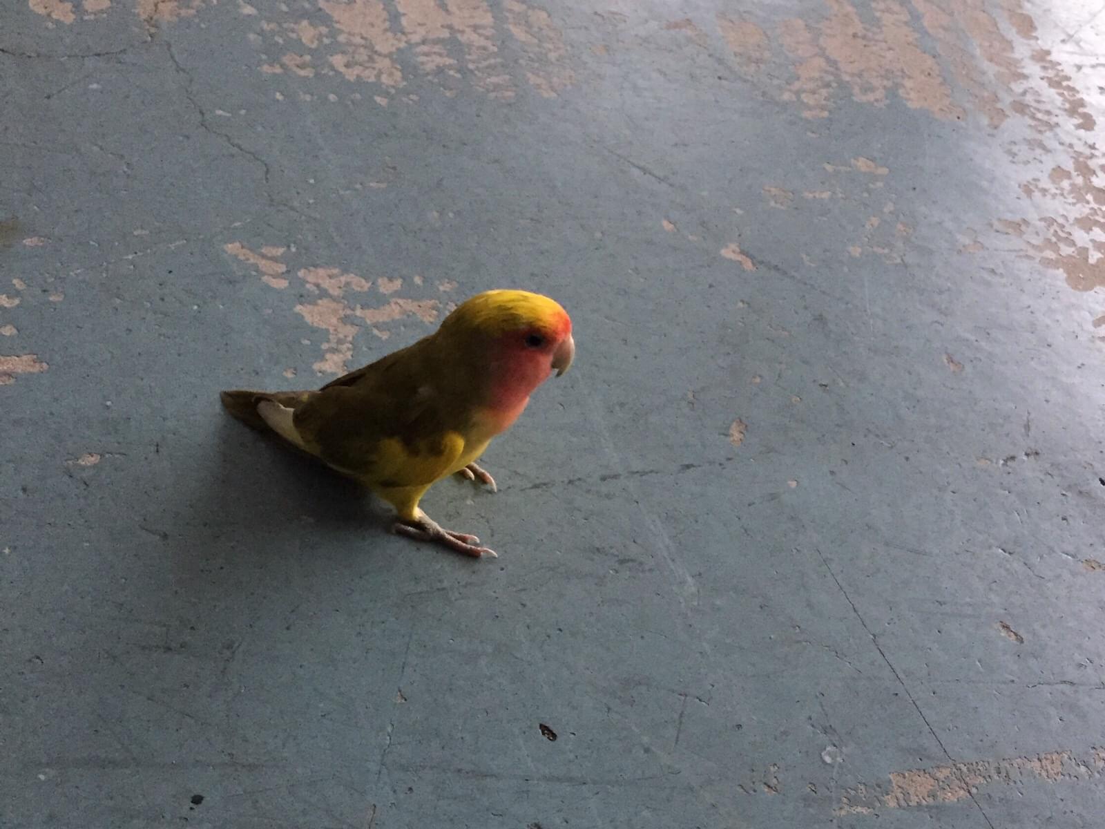 夕方6時、会社の駐車場でインコ を見つけました。体全体は緑色で頭部はは黄色く、顔は赤っぽかったです。