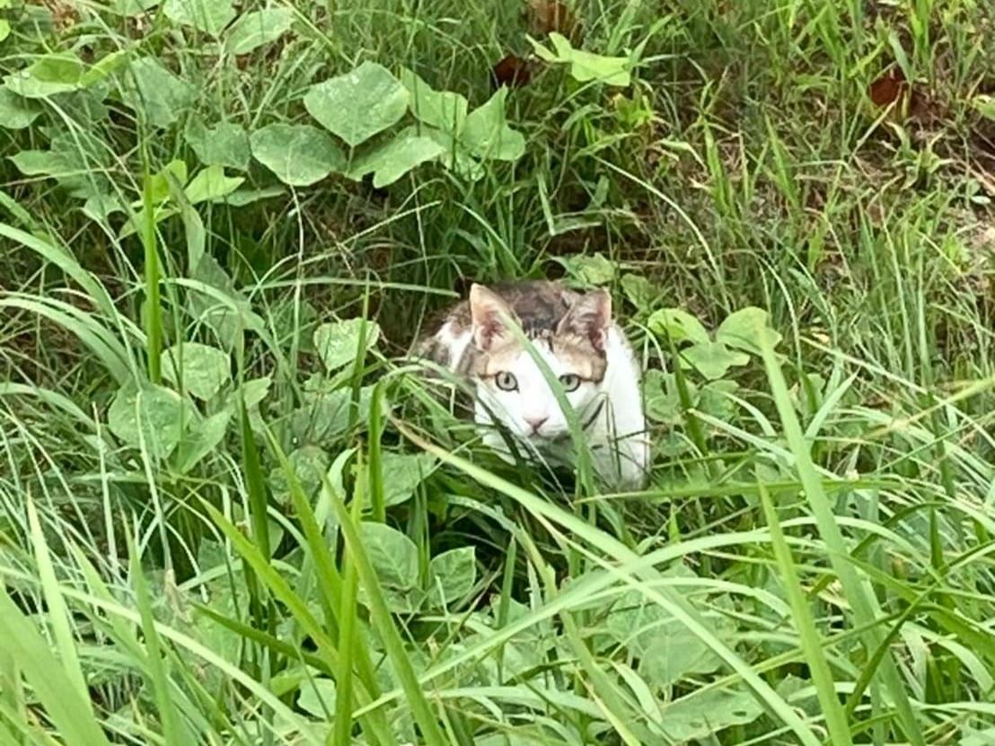 特徴▶️キジシロの猫。黒っぽい首輪。