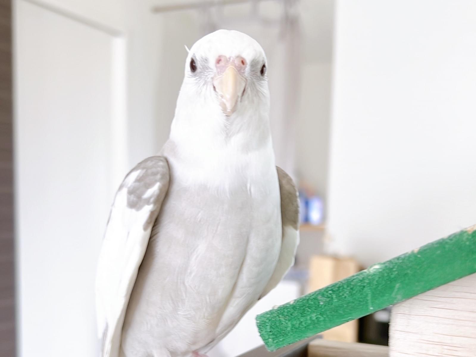色はグレーの濃淡、白で声は高め、シナモンと呼ぶと反応します。