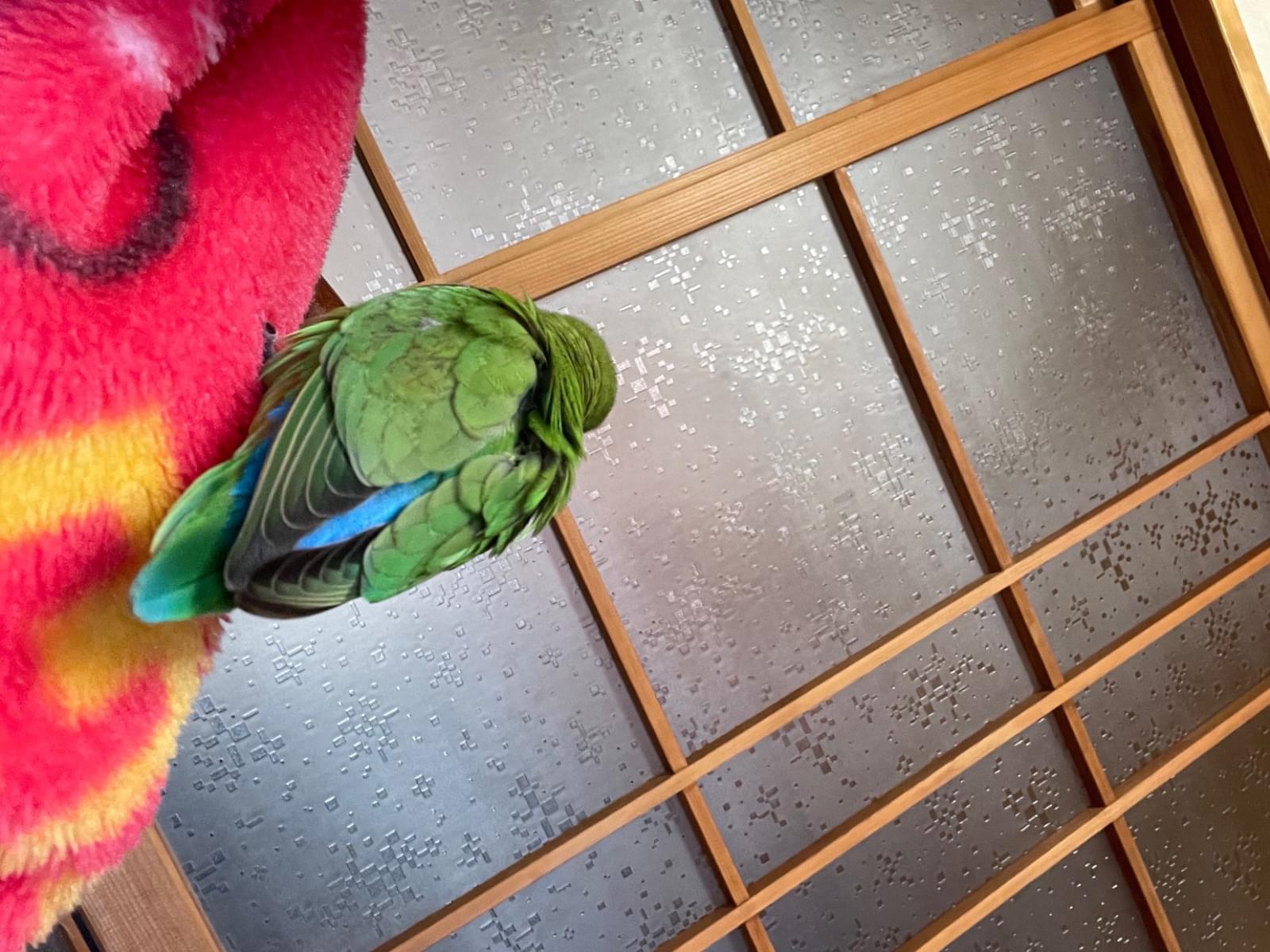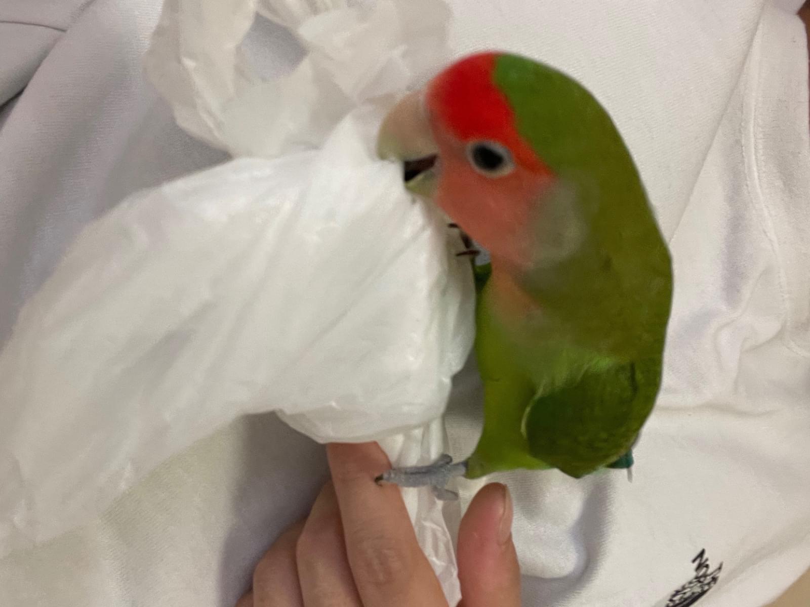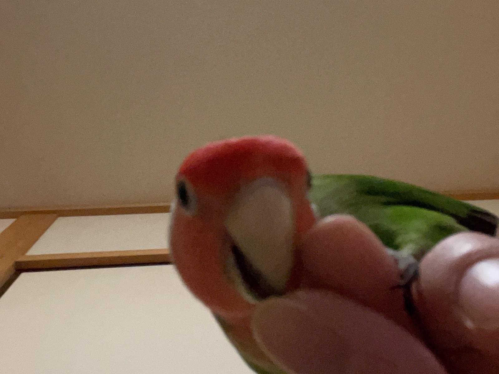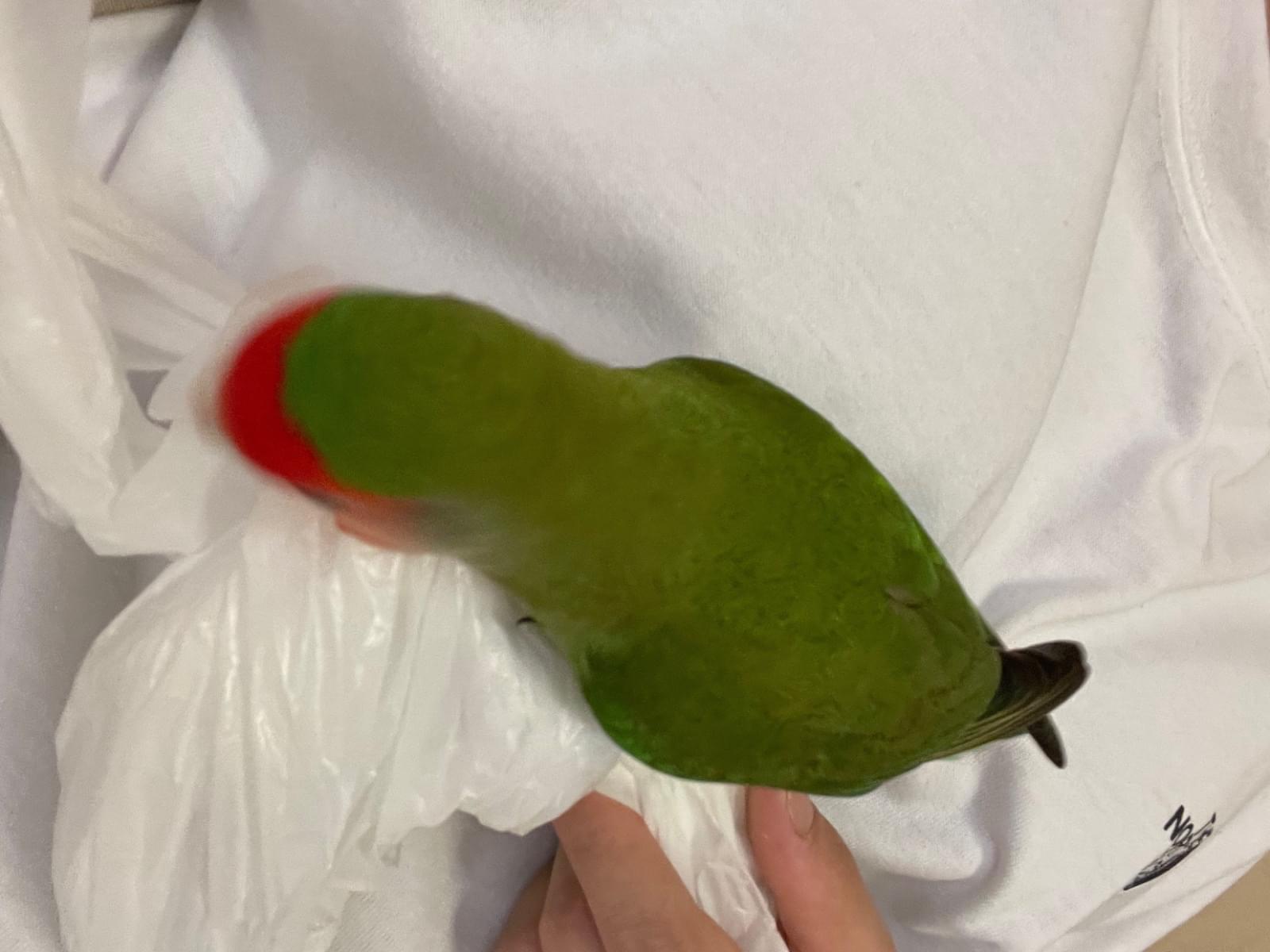 特徴:顔が赤く、体が緑、尾が青のオスのコザクラインコを探しています。声は高い方です。
