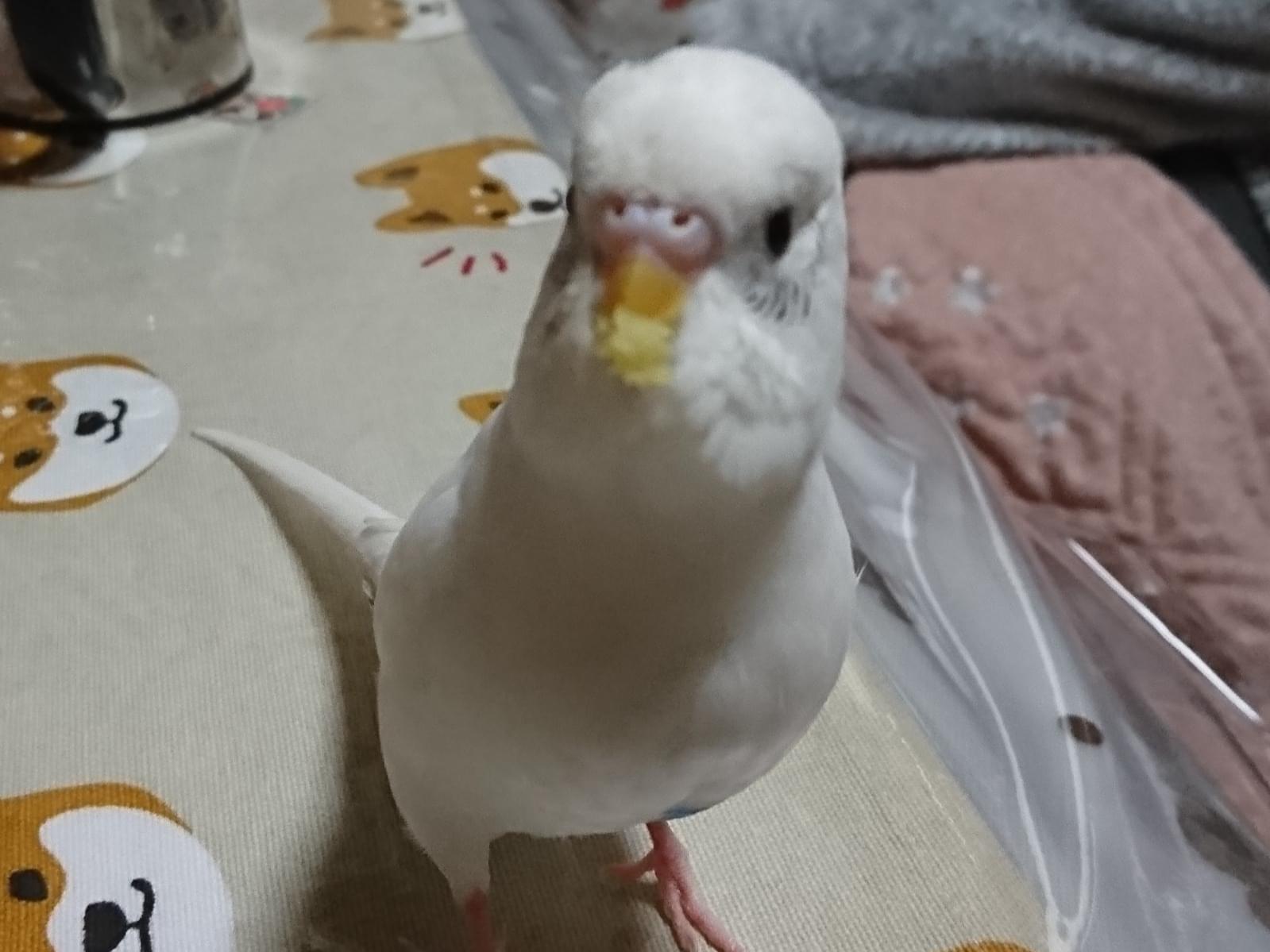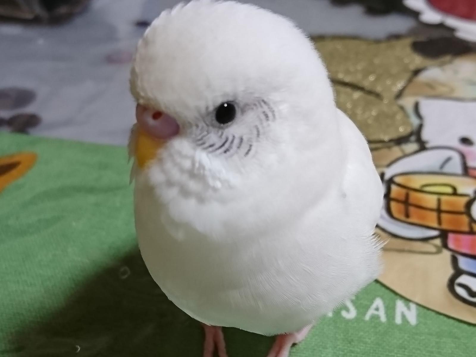 お腹の辺りにブルーが入っていますが、ほぼ白いです。呼んだら鳴くと思いますが、臆病です。指や肩には乗りますが、手で捕まることが嫌いです。