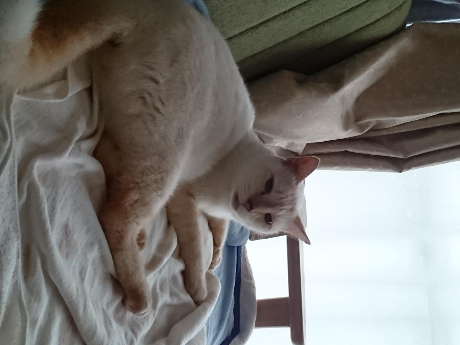 目がブルーで、シャム系の全体的に白毛で尾と足先、耳、顔の中心部が薄茶の大柄な猫を保護しています