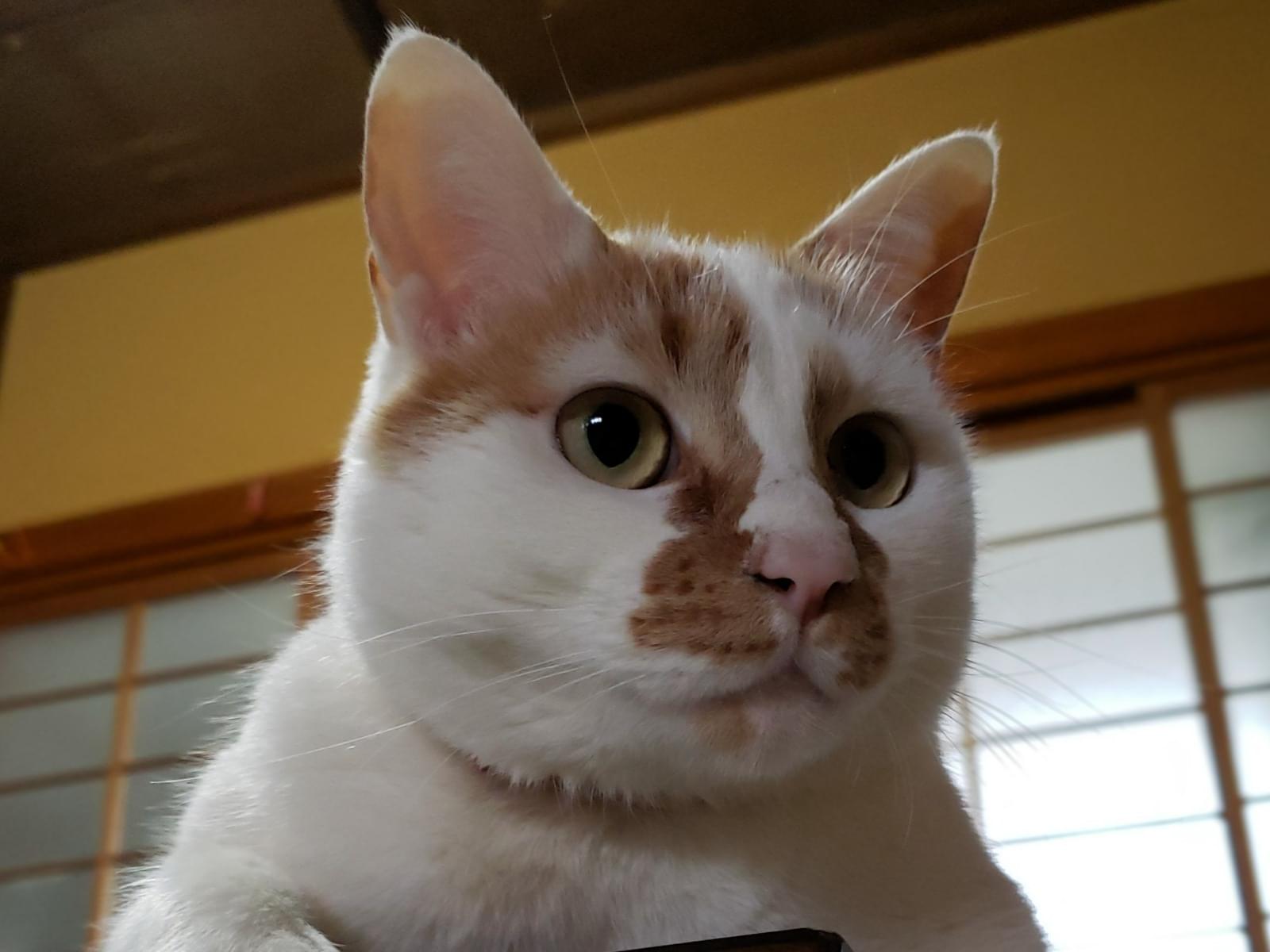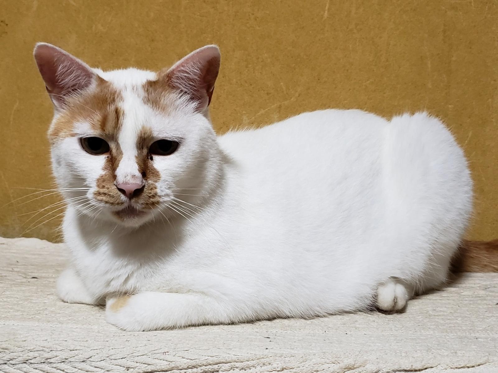 頭としっぽ、前足に少し茶トラの模様がある猫です。
