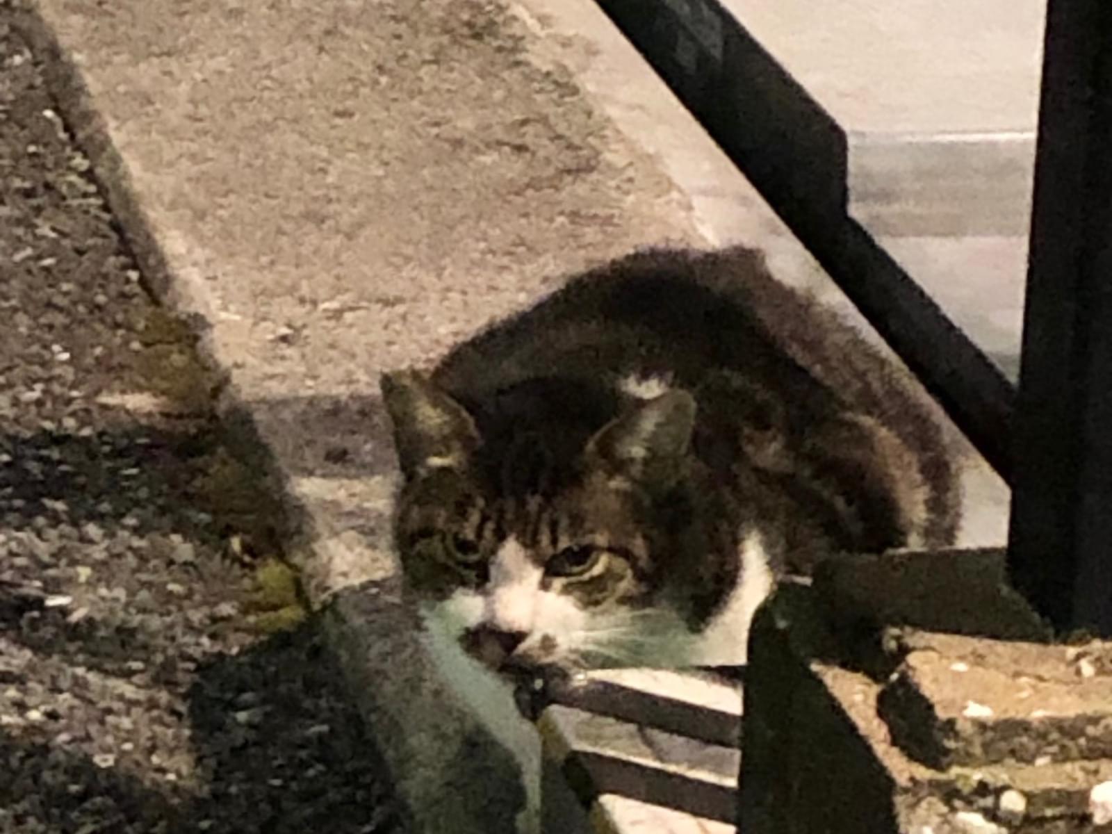 こちらを見てずっと鳴いていたのですが、マンションの柵の向こうで中に入る事が出来ませんでした。昨日も通りましたが、今日初めて目撃しました。万が一、飼い猫だったらと思って念の為、投稿します。