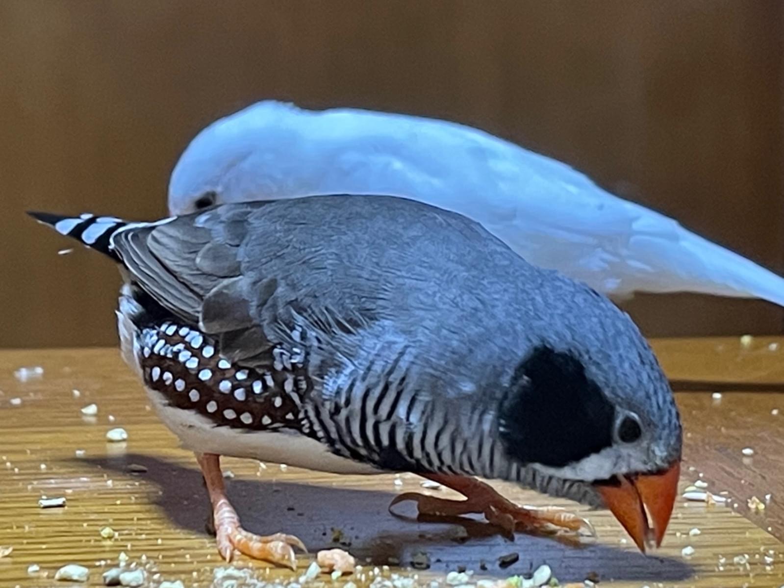 子供の不注意により窓より逃げてしまいました。完全な手乗りではないのですが、人の肩に自分から乗ってきたりします。おもちゃのアヒルの鳴き真似をしているのでおもちゃを鳴らしてるような声をしてます。ほっぺが黒色で体の横の水玉模様は茶色です。体型を低くして歩く癖があります。