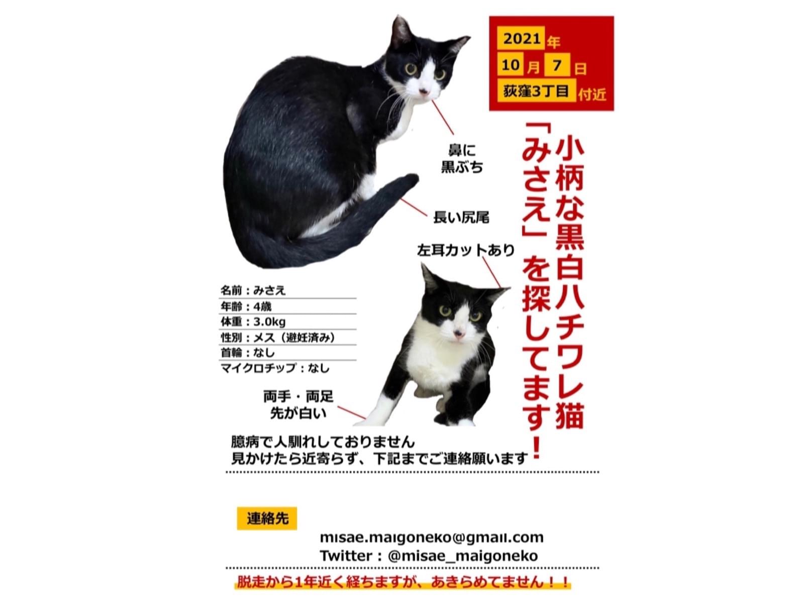 迷子猫みさえ4歳黒白ハチワレ♀東京都杉並区荻窪三丁目脱走