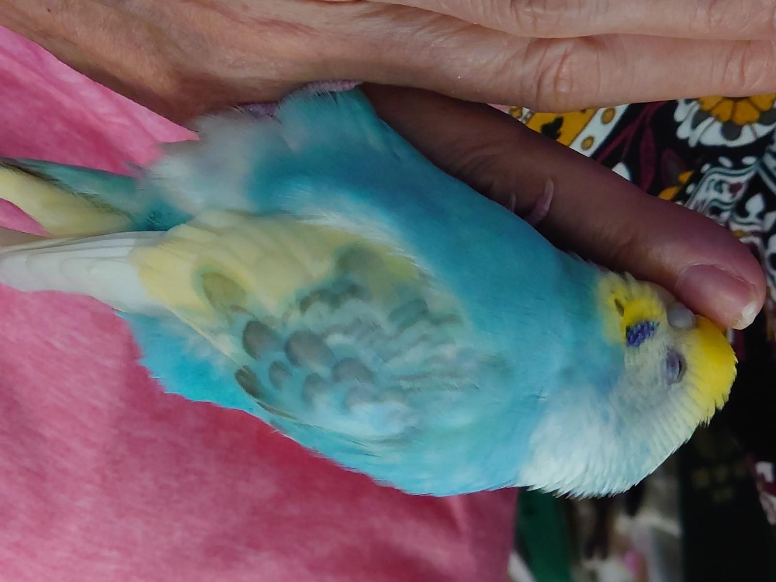 頭が黄色っぽく、ボディはきれいな水色、ほっぺたに群青色の斑点、その下に横並びに黒の1〜2の斑点がはいった顔をしてます。
