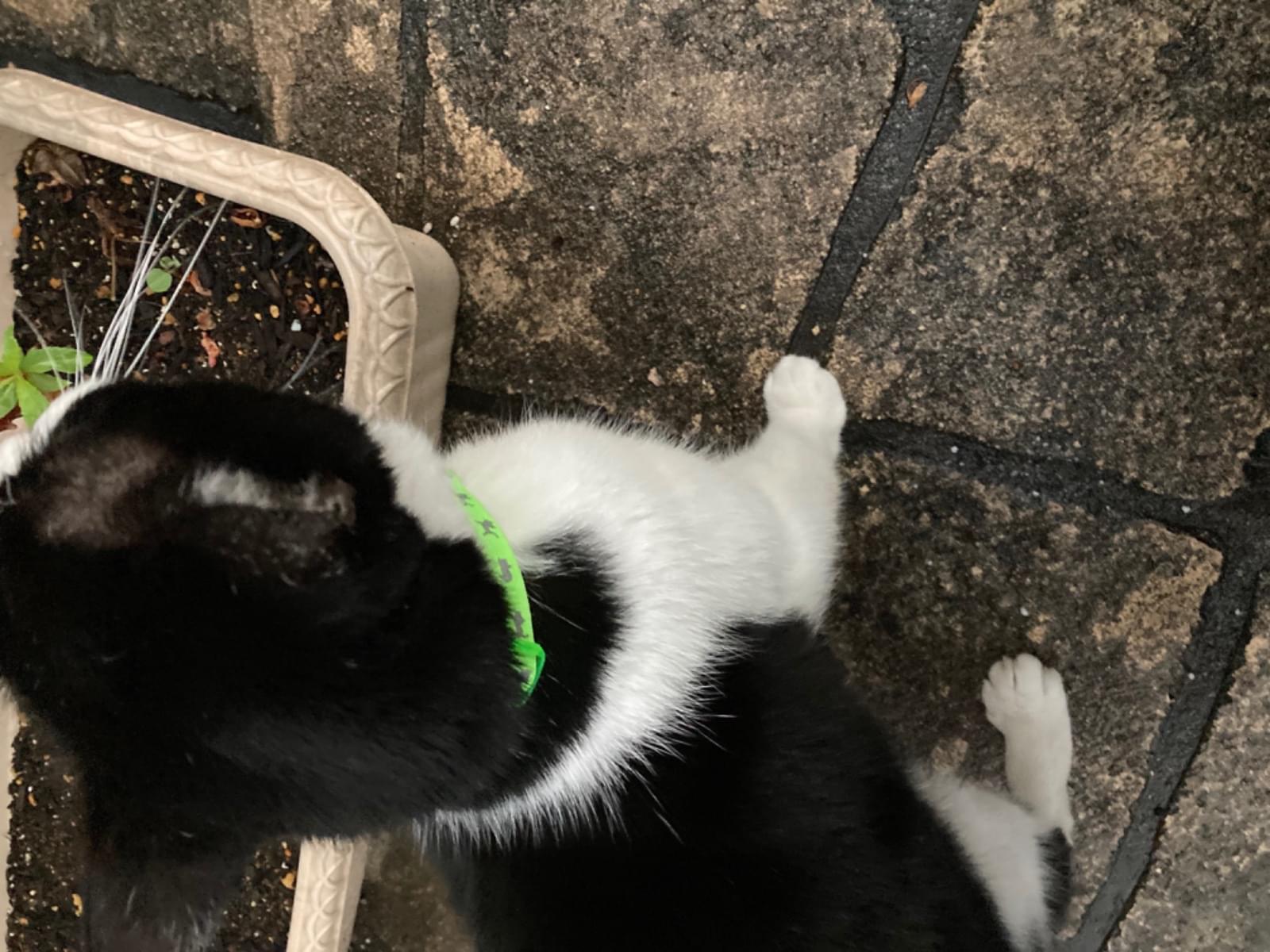 蛍光黄色の首輪をつけた黒と白の猫ちゃんを道路の脇見つけました。車も外飼いならやめた方がいいと思います