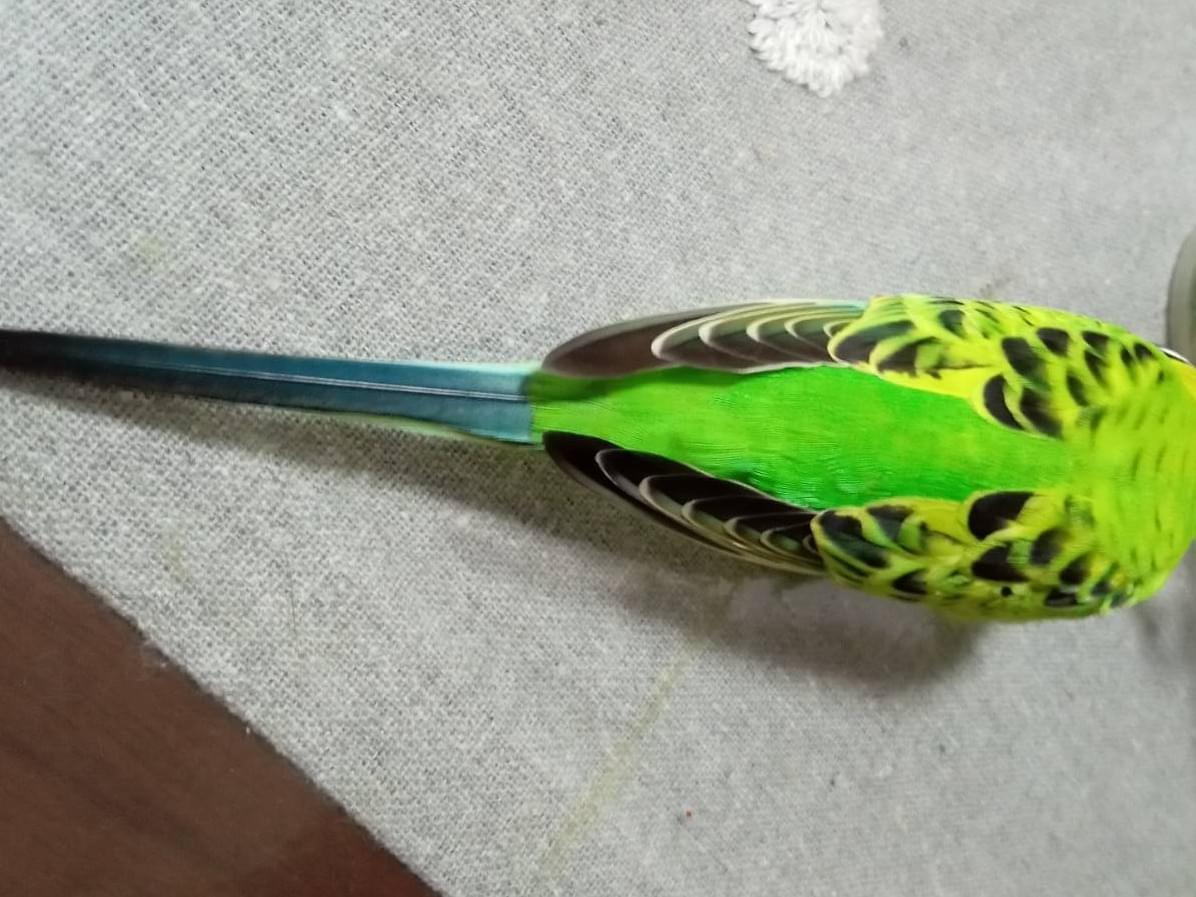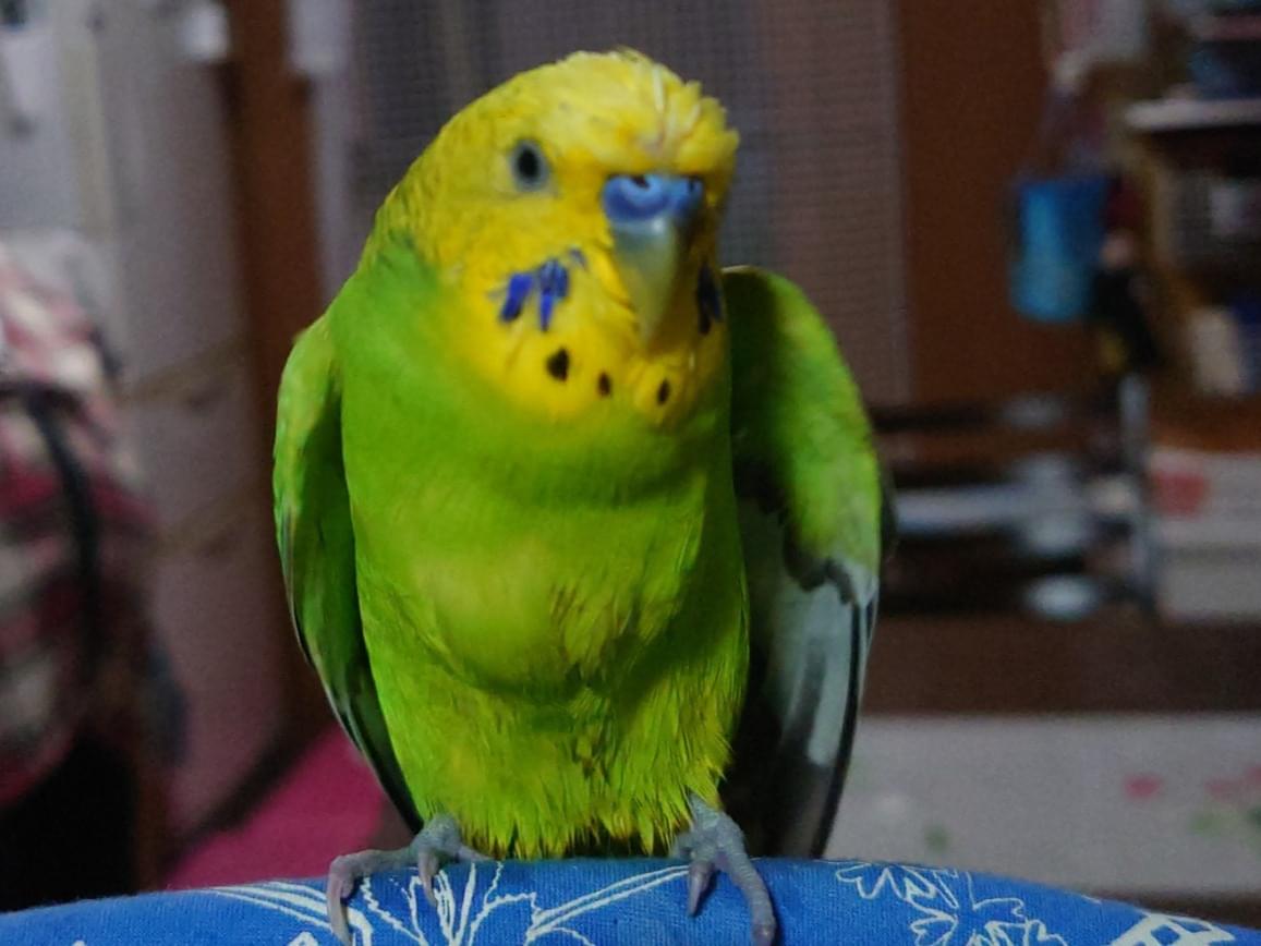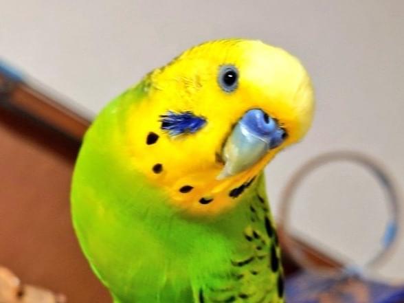 宝塚市で迷子に。緑色、目の下に鮮やかな青があるセキセイインコです