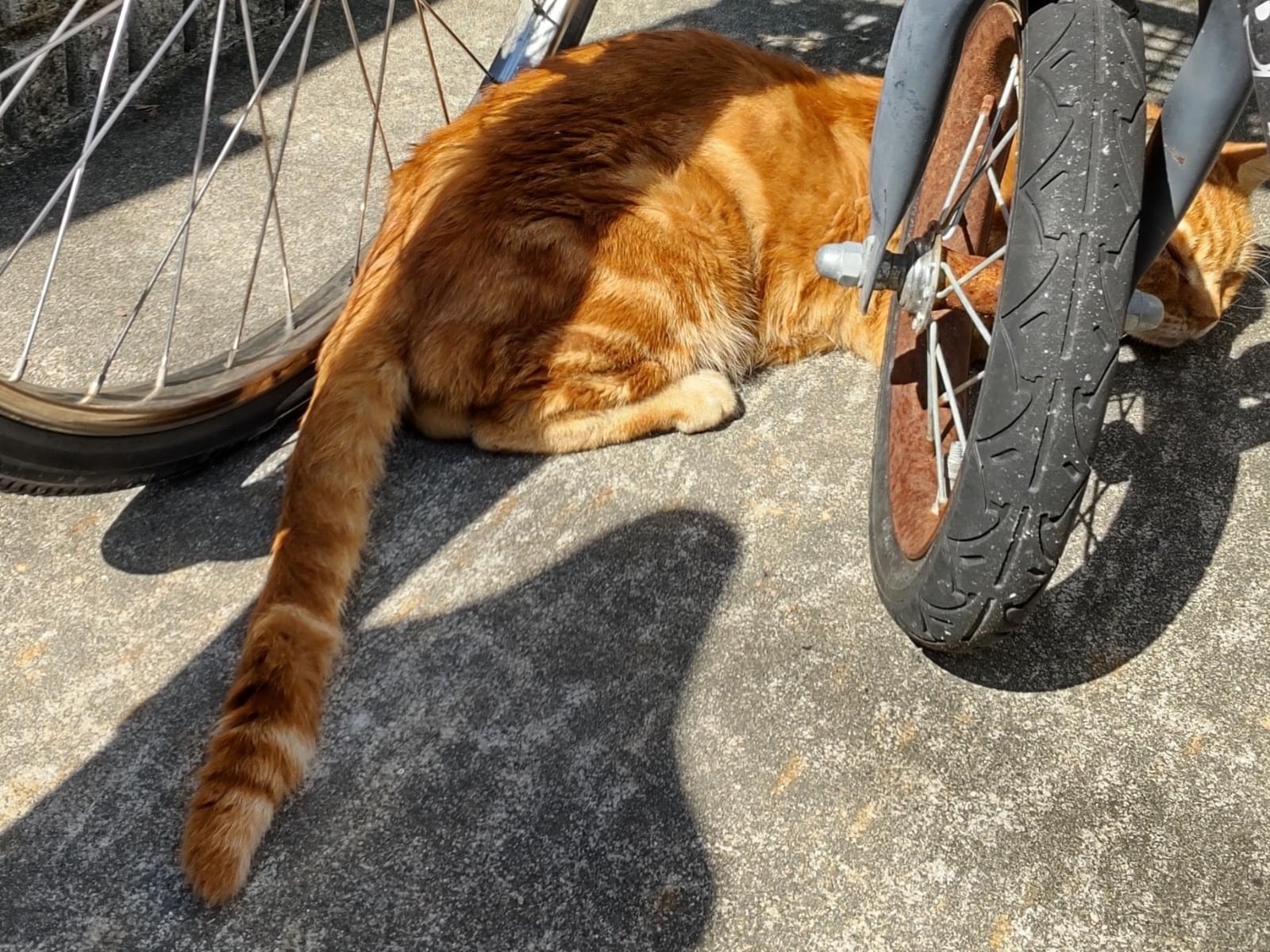 濃い茶トラ猫 オスを見かけました。尻尾は長くてまっすぐ。大きな縞模様があります。