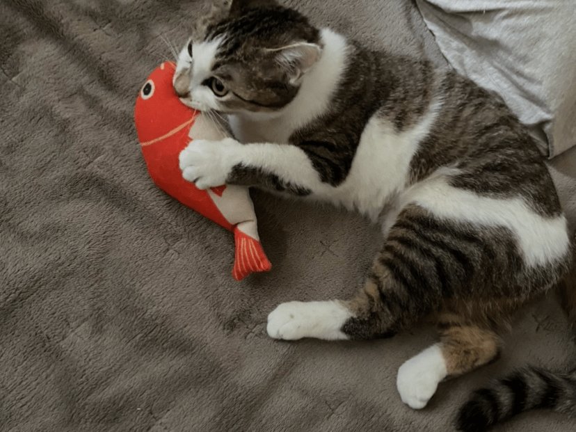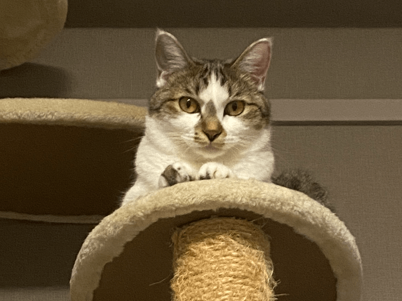 白色に茶色とシルバーの混ざったブチ模様。尻尾は長くて縞々です。白い右手に指輪のようなブチ模様。両目の間にもブチ模様があります。