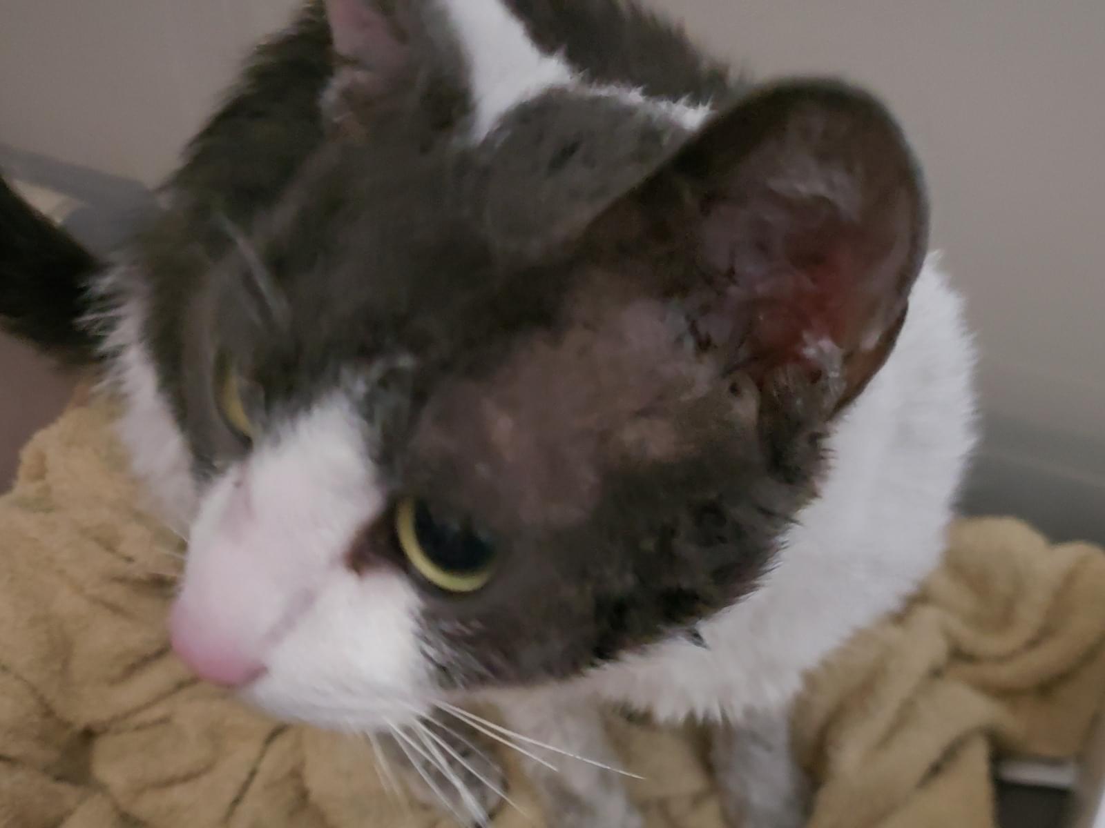 右耳が白色のハチワレ、よく鳴く人懐こい子です。