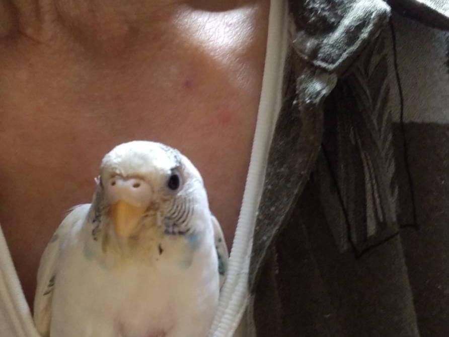 セキセイインコを探しています。白色で羽根に黒い模様があり、おなかの下あたりは水色です。