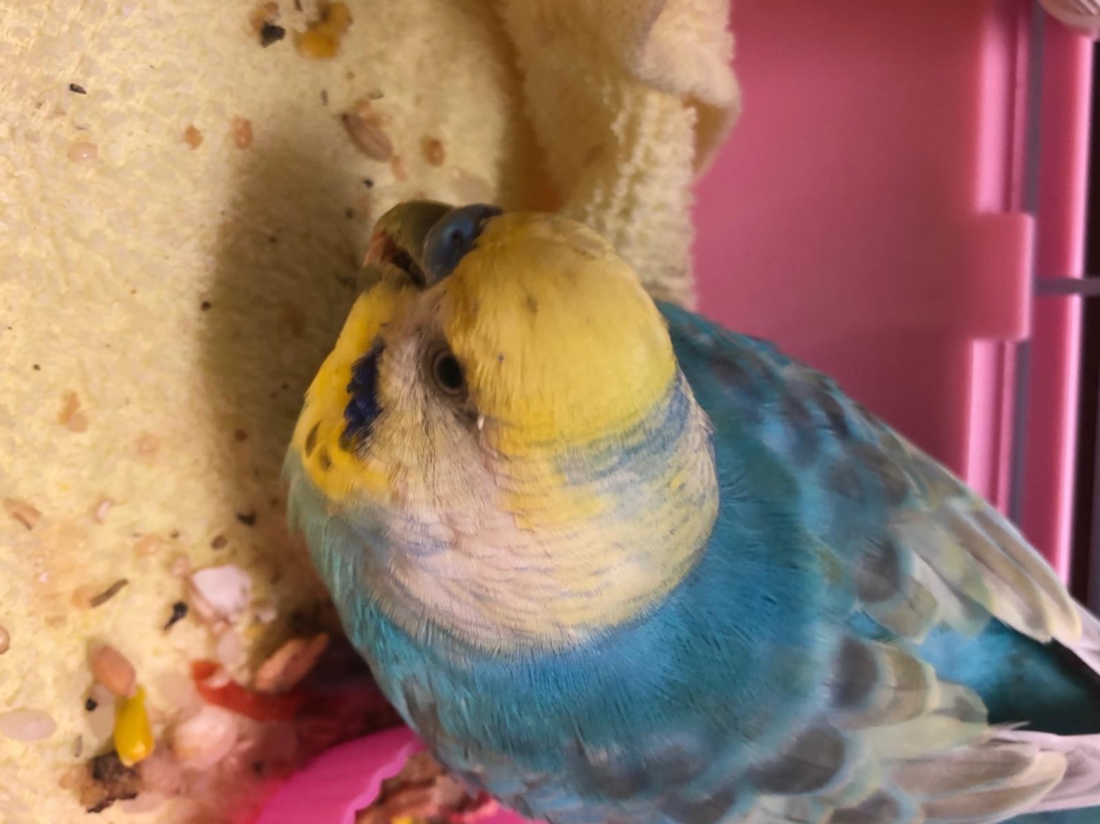 迷子のセキセイインコを駐車場で見付け保護しました。最初は少し弱っていましたが、エサをあげたらよく食べ、時々チュンチュンと鳴いています。今のところ喋ったりはしません。お心当たりの方いらっしゃいましたらご連絡下さい。