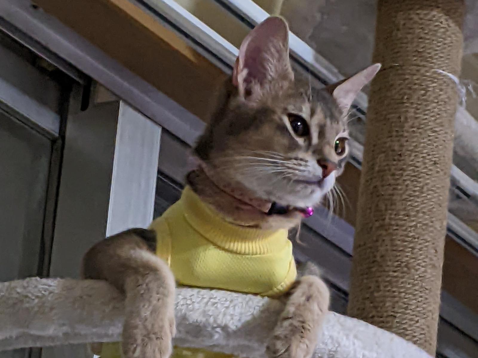 アビシニアンの毛色はブルーで避妊手術したてでお腹の毛が剃ってある