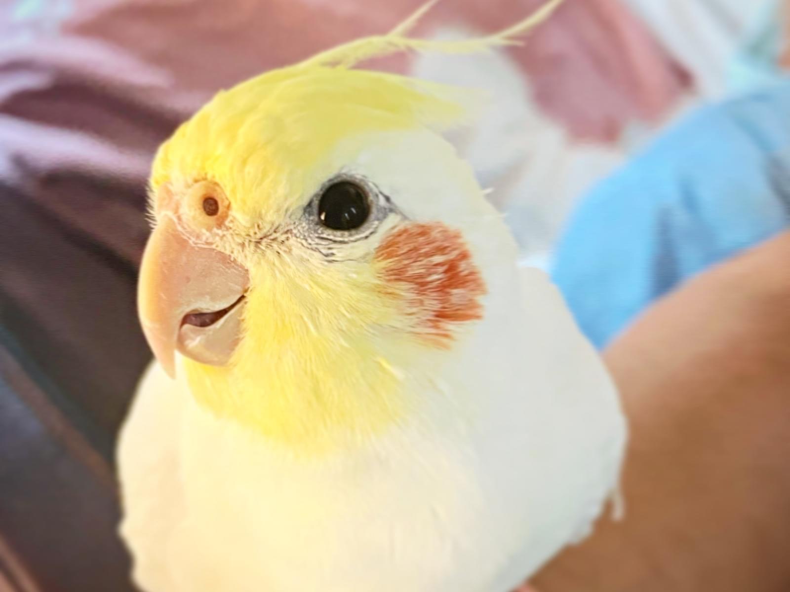 薄黄色でほっぺがオレンジ色のオカメインコです。