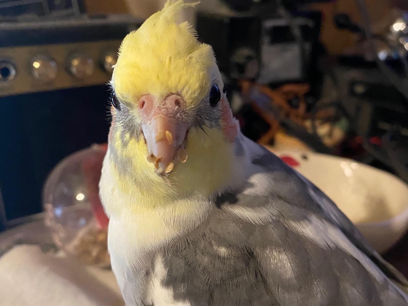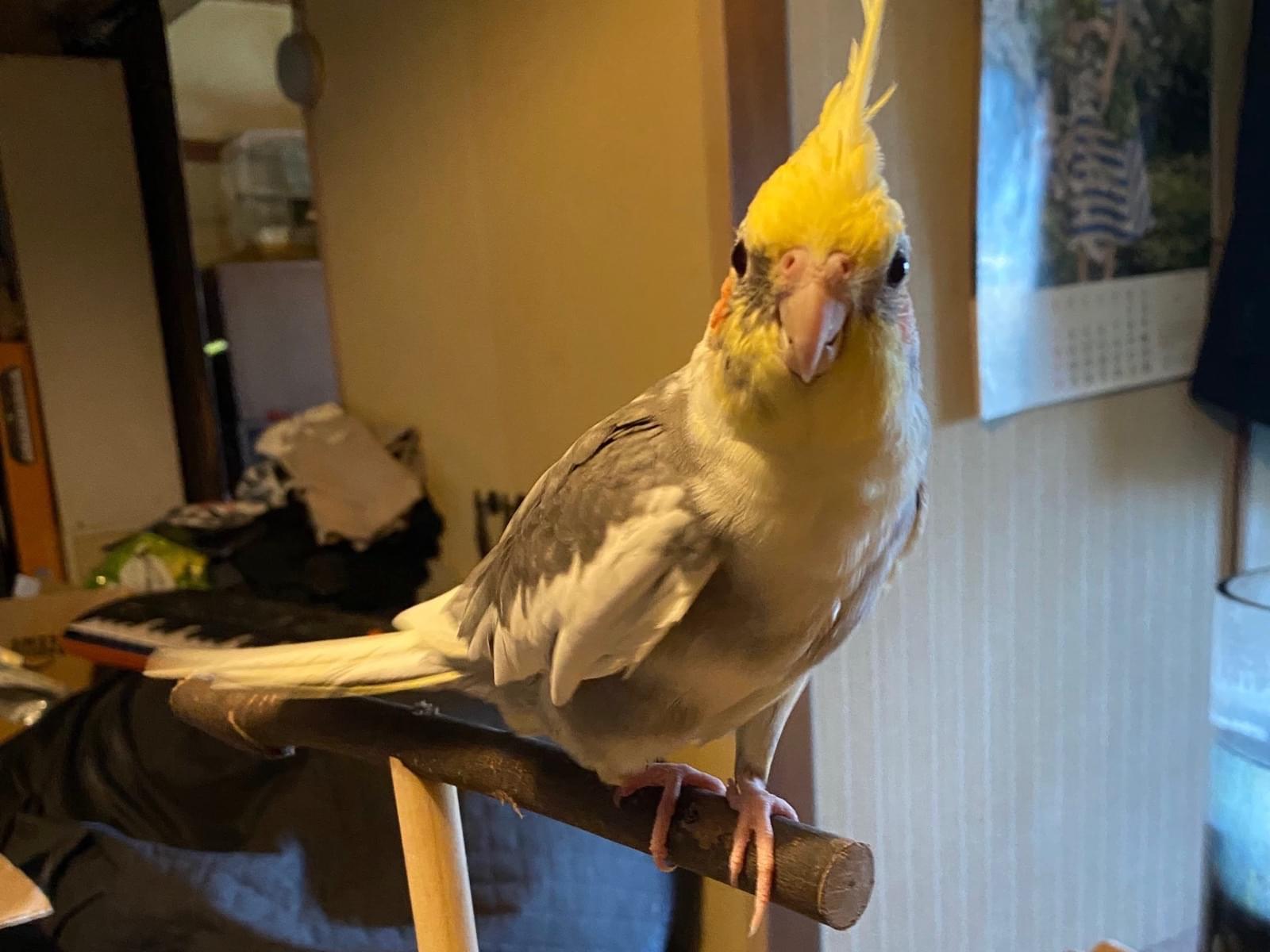 顔が黄色で全身はクリーム色、羽はグレーのノーマルパイドです。