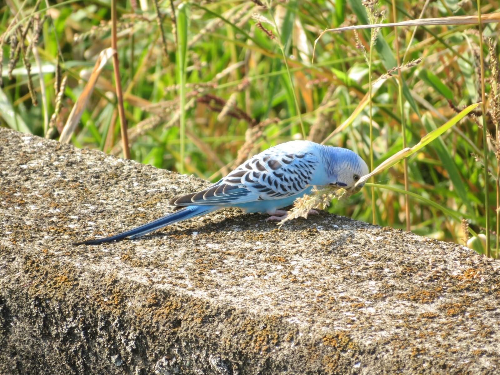 青いインコが下川津の高速道路と大束川の間の堰がある付近の田んぼで草の実を食べていました。写真を撮っても逃げないので人に慣れている感じでした。