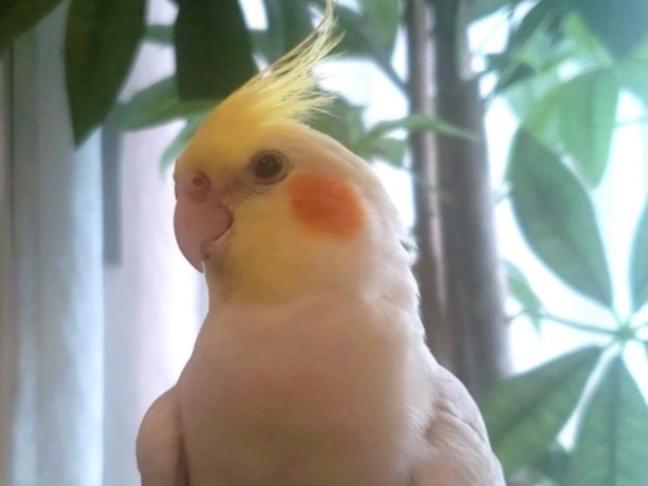顔が黄色で体は白とグレーが混じった色をしています!ほっぺに丸いオレンジ色の模様があります。