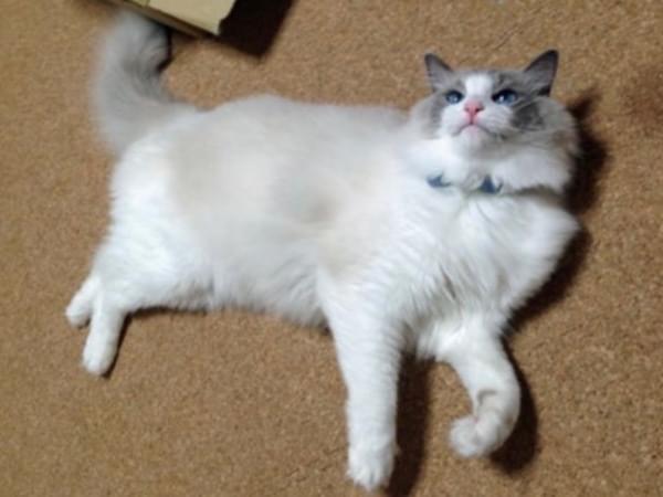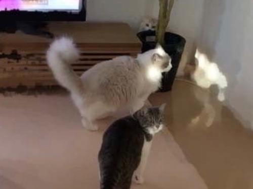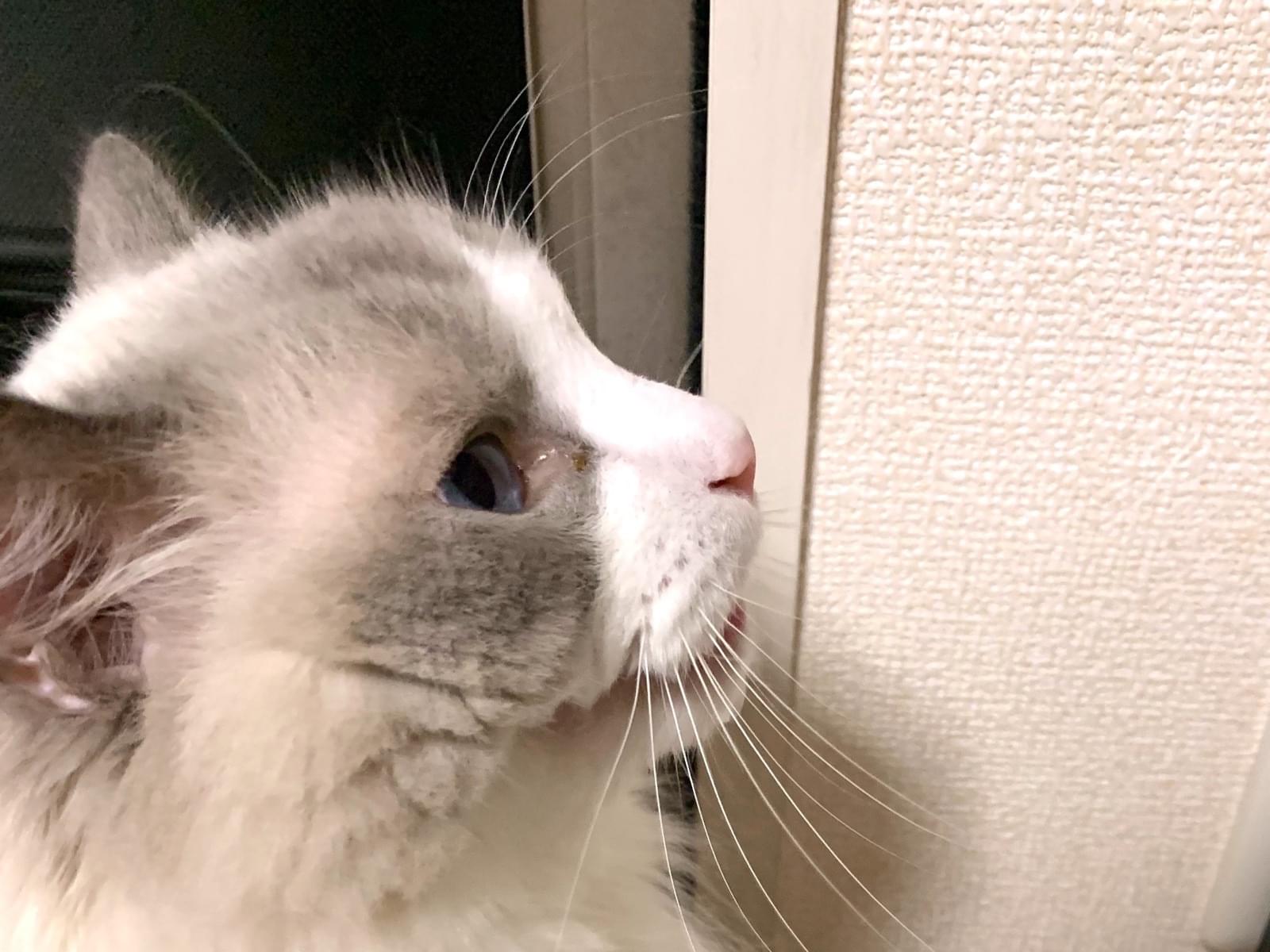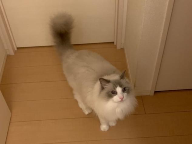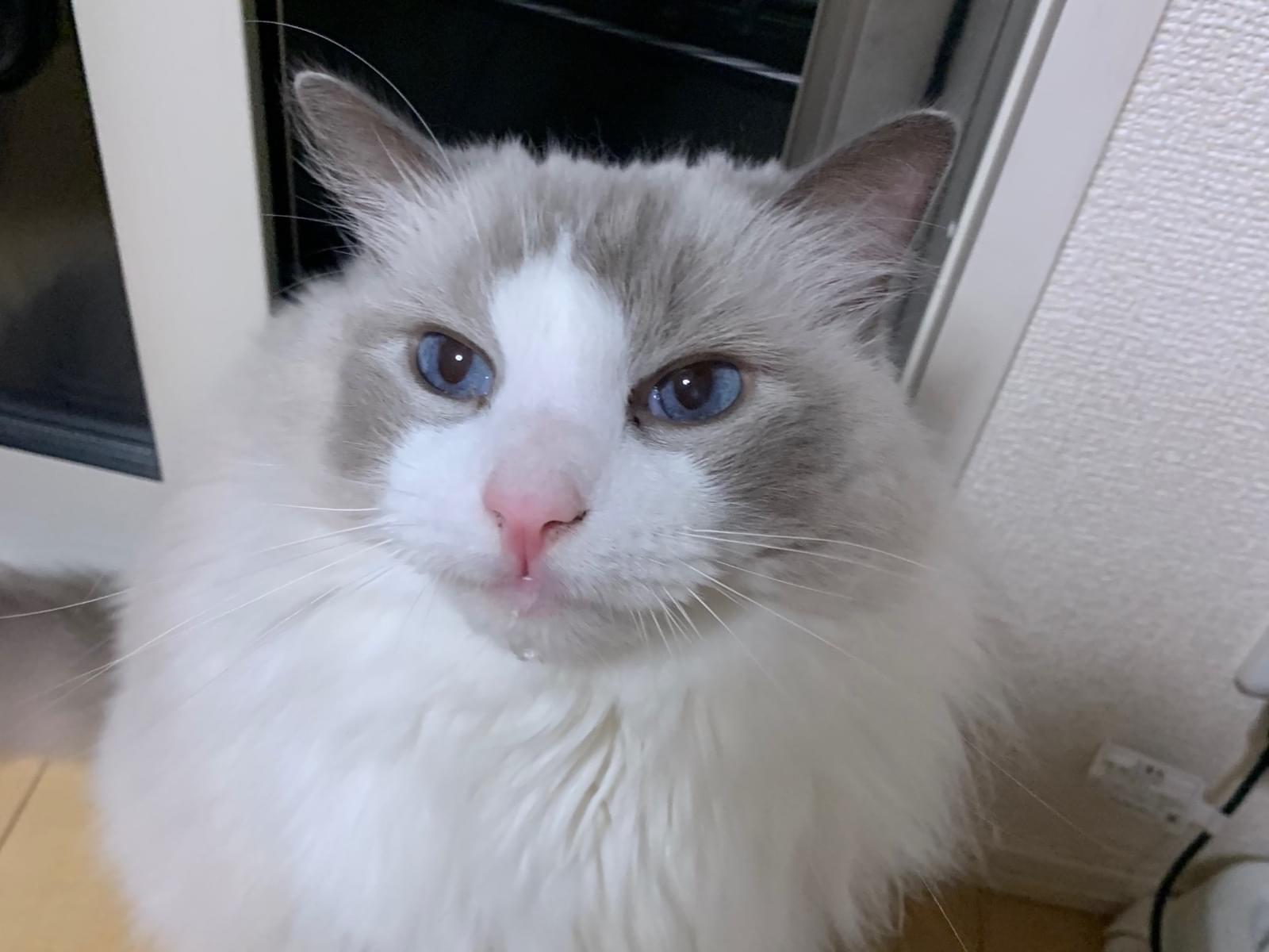 全体的に白く、顔の上半分(ハチワレ風)と尻尾がグレーです。目は青で、背中が薄いグレーで毛は長め、声は高めです。