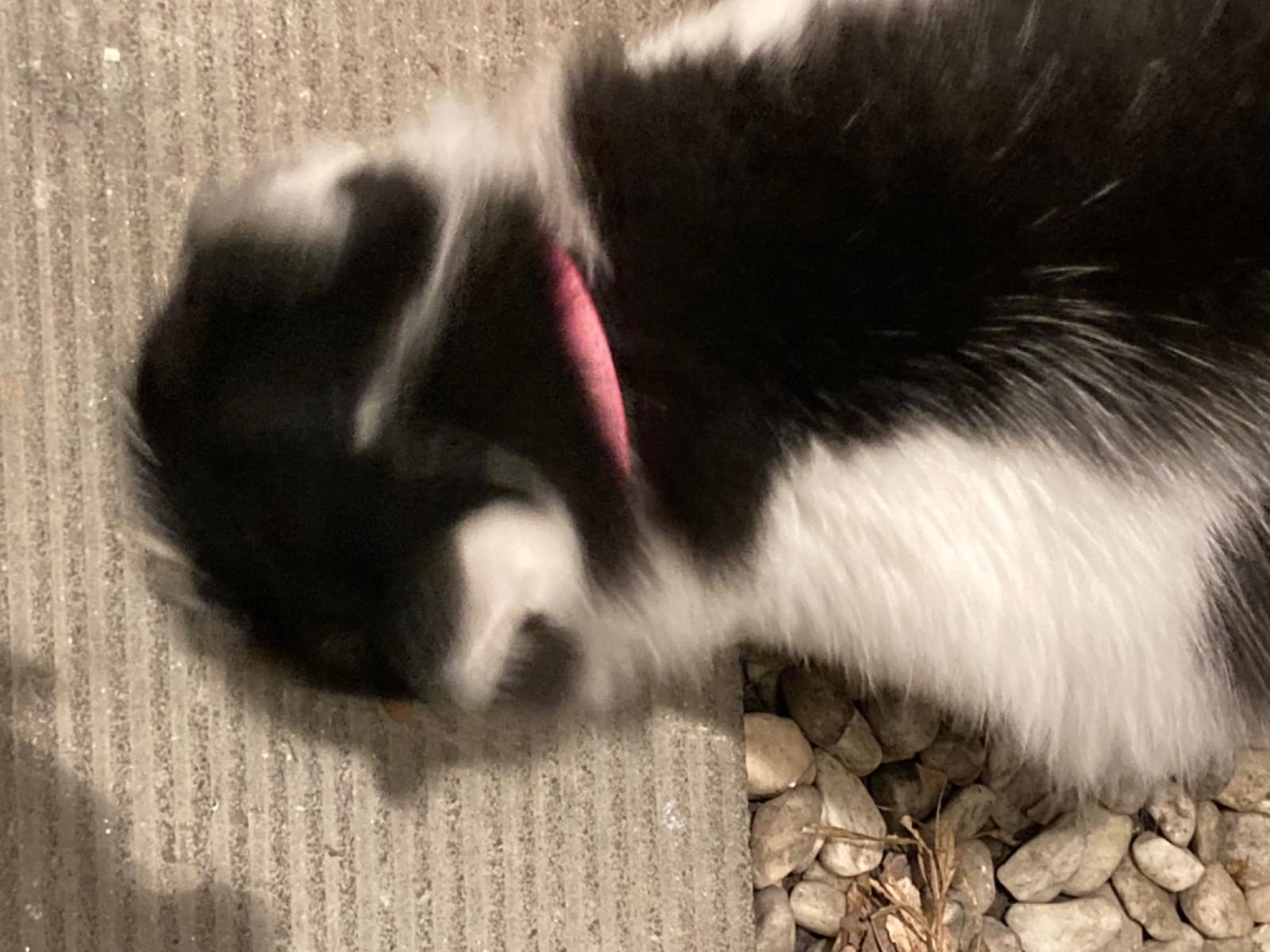 ピンクの首輪付きのハチワレ長毛白黒猫を見かけました