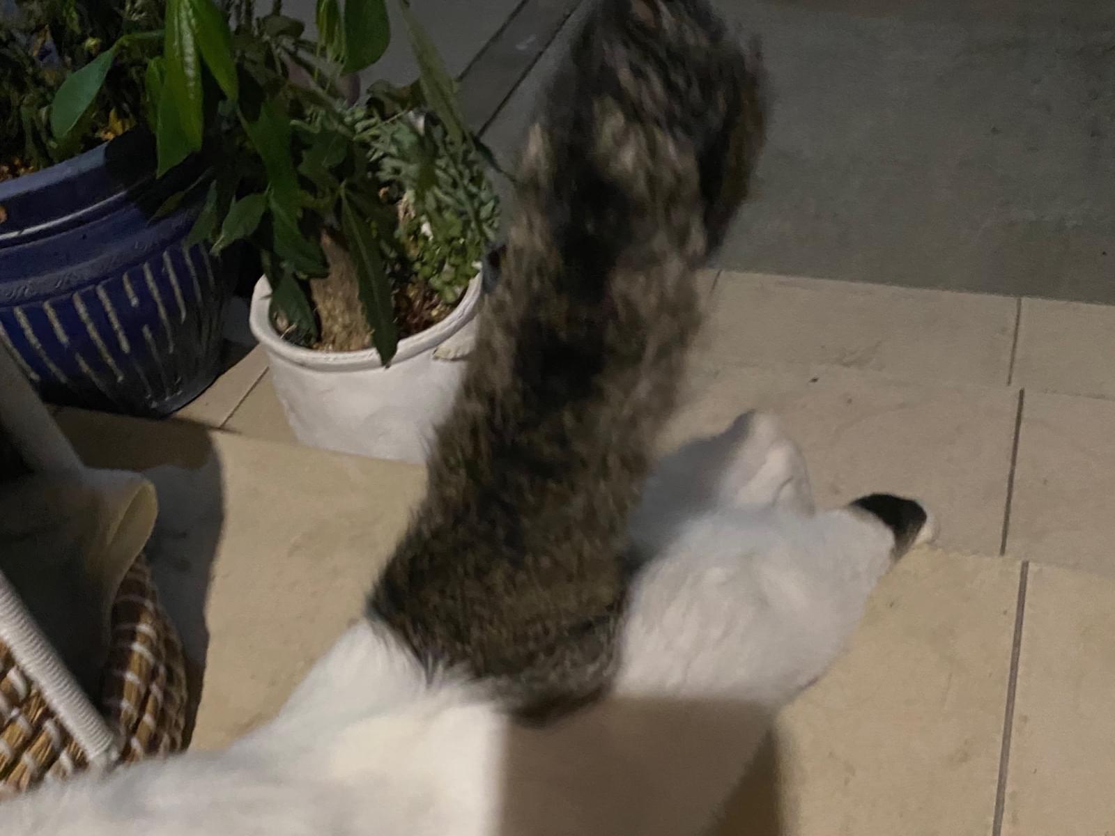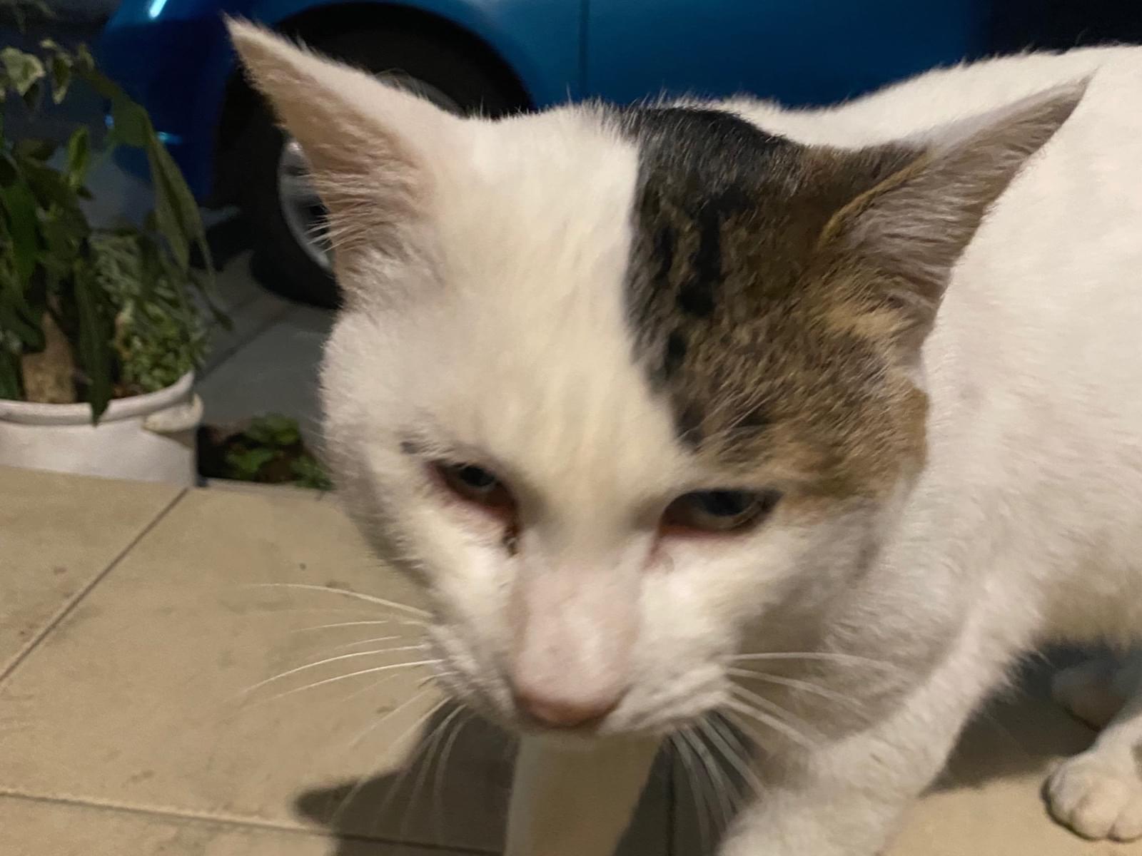 全体白、柄が少しキジトラのよう、しっぽがハート