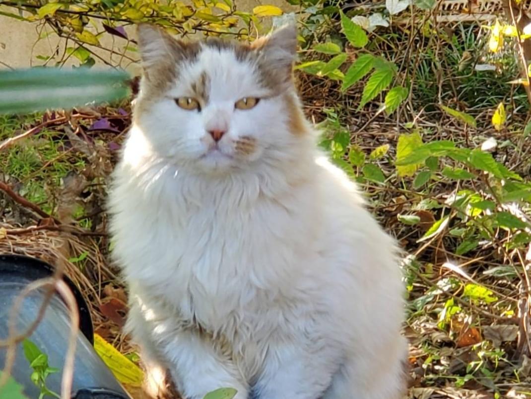 人をあまり怖がらない感じ&動きも俊敏ではないので、もしかしたらそれなりの年齢の飼い猫では?という気もします…(首輪の有無は確認できていません)。