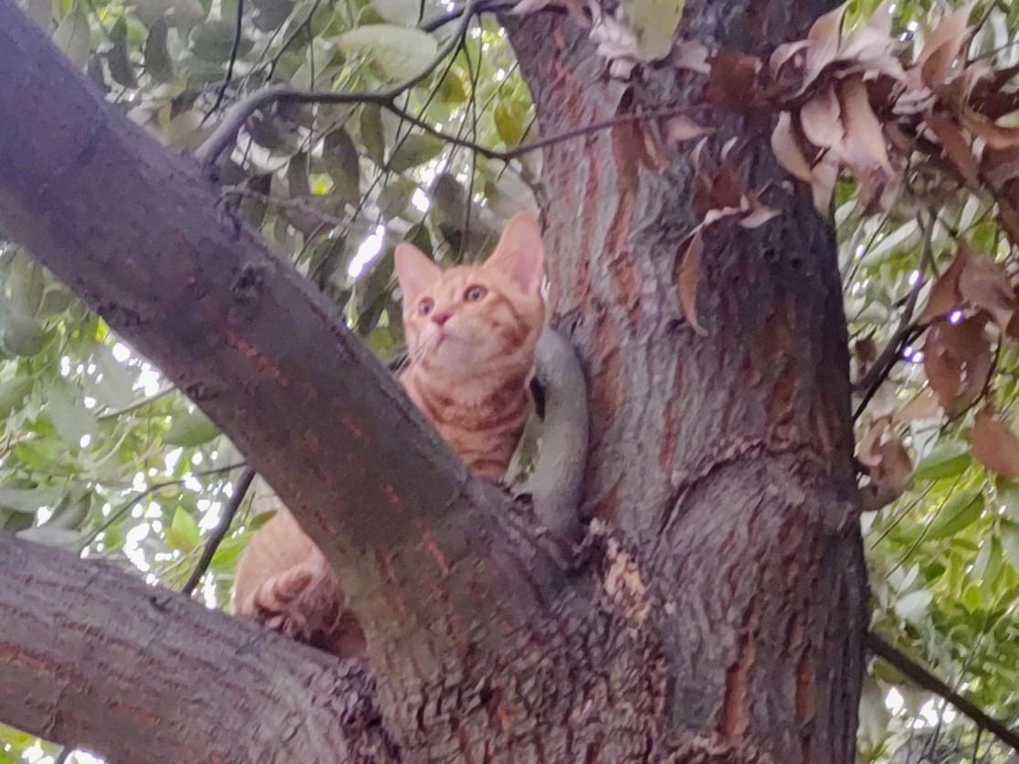 大絶叫で鳴いていたのでご飯をあげました。翌朝も同じ場所の木の上で寝ていました。ご飯をあげました。家族会議して、次の日保護しようと決めましたが会えなくなりました。