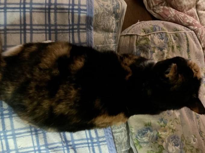 毛深く埋もれててわかりにくいですが、ちりめんの赤っぽい花柄の首輪をつけています。